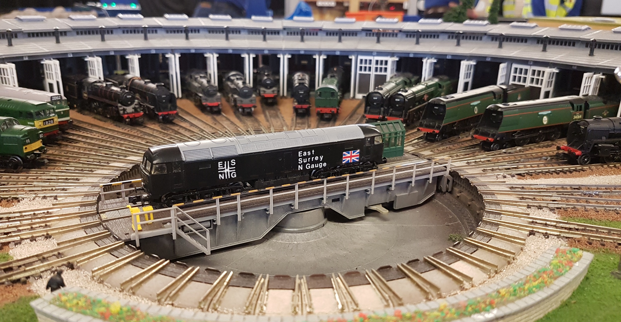 Friday afternoon, Allan, Derek and I loaded up Allan’s truck, and headed for the West Sussex show. We put together a joint N-club modular circuit with the West Sussex boys. The actual layout went together very well on the Friday evening, but we had to drop two modules as the room was slightly smaller than expected. A certain amount of fiddling was needed with the wiring, as the WSNG use a different connection arrangement from us at ESNG. Still, by the time the show opened at 10am on Saturday, all was working reasonably well, and continued to do so for the two days. On the Saturday morning, we even had time for a full English breakfast before the show.