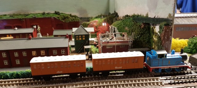 Martin Micklewright’s Lowater Basin got favourable comments, with its detail and working lighting. Here we see Thomas passing on the main line….