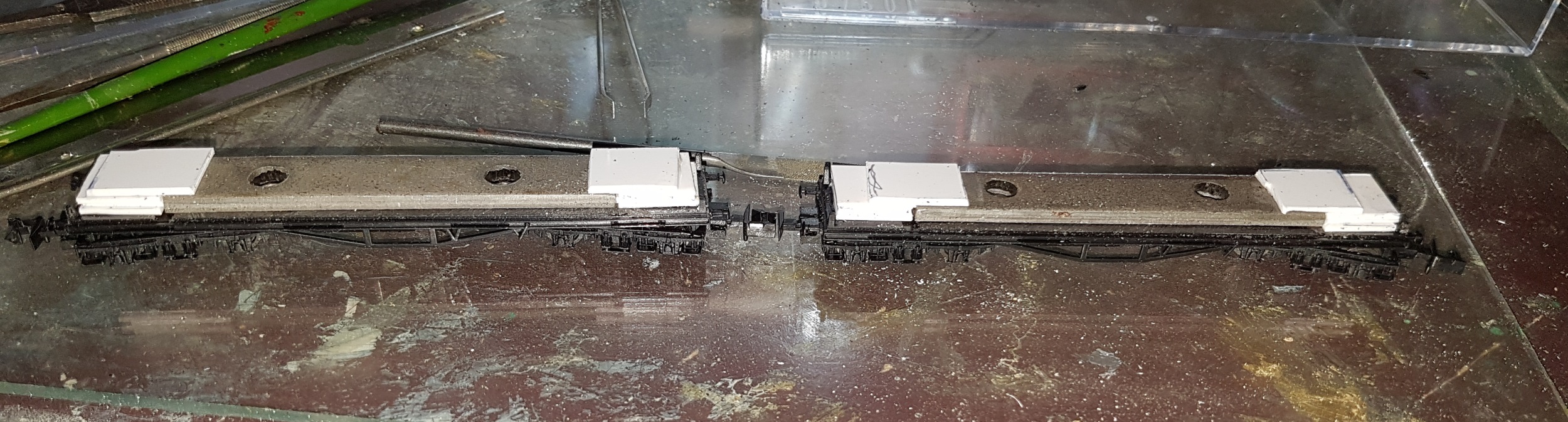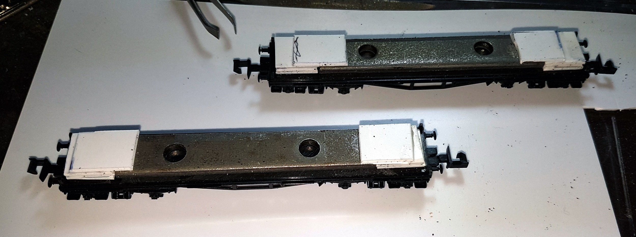 All is needed is to flatten the raised detail on the chassis, except the four pegs on the four corners that locate the body. The Lima weight is added to the chassis. It could be glued in place, but I opted for a plastic card retainer to prevent it coming loose in the future. A coat of grimy black, and underframe complete.