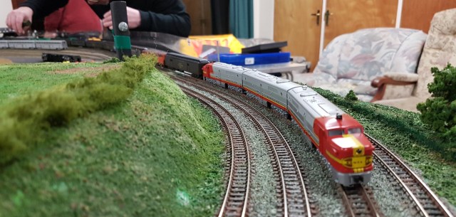 There was a strong American flavour contributed by Simon, Ian and Graham. Here, Simon’s Con-Cor PA-PB-PA set head an express parcels train.