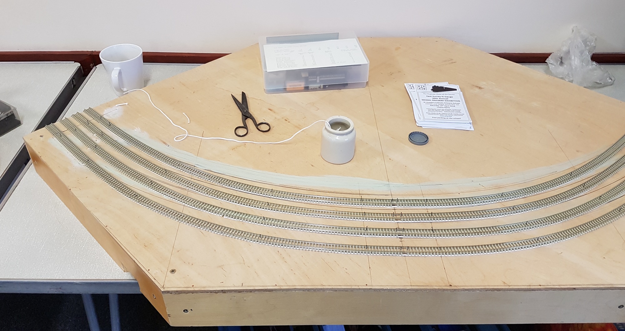 Meanwhile, Derek was super-elevating the track on the new club N-mod corners. A length of string under the outer sleepers PVA’d in place seemed to do the job…..
