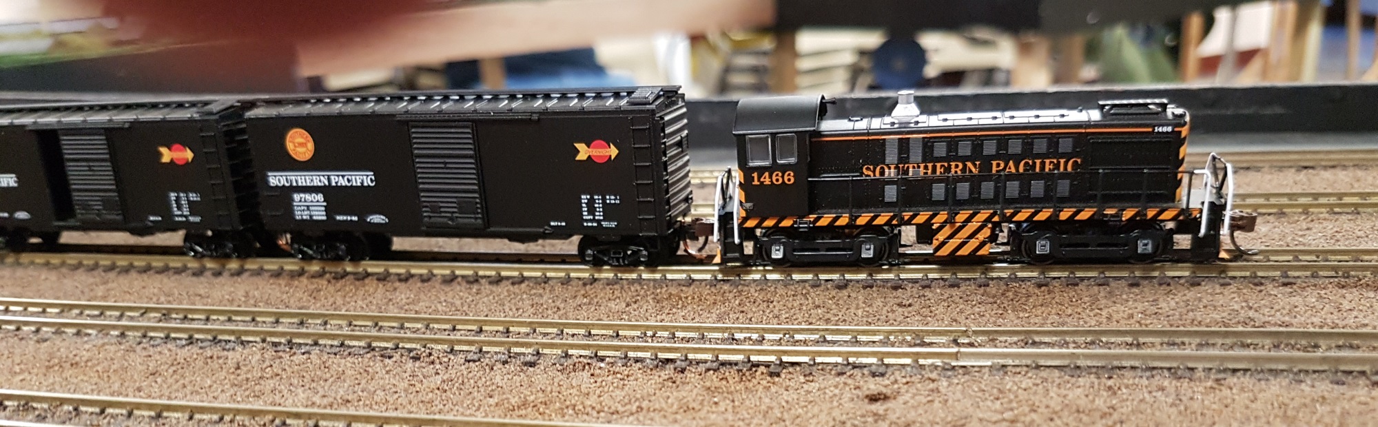 I then ran a couple of Southern Pacific good trains. The grey 70-tonner looks tiny against the Alco S4 switcher, but both managed a sizable goods train (though not up to Paul’s standards!)