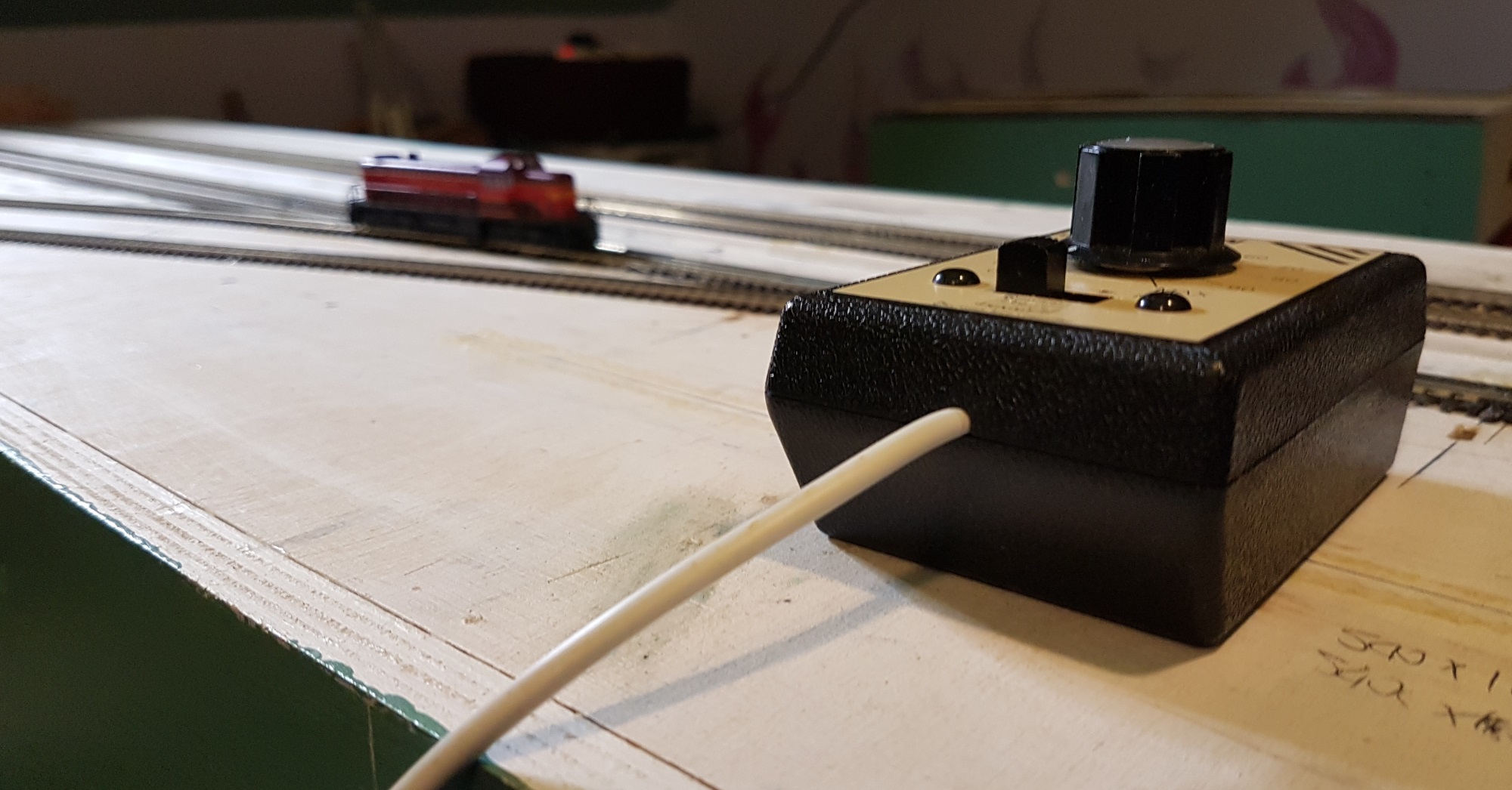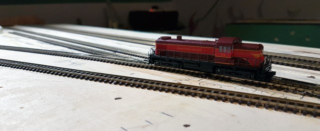 And I plugged in my old Gaugemaster hand-held controller and the test loco (an old Rock Island Kato RS-2) happily ran over the whole board. Back to where I was a year ago when I decided to rebuild the modules…..