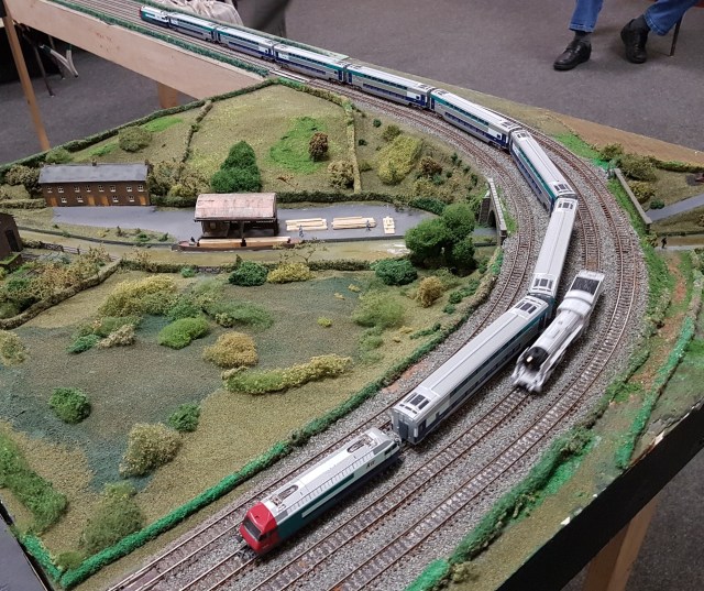 Once again the layout displayed the diverse taste of the members. I didn’t get a shot of the Gatwick Express (it can be seen in the second photograph) and other UK DMUs that got a run out through the evening. I suspect that the only ‘club layout’ that we could ever build would be an international railway museum…..