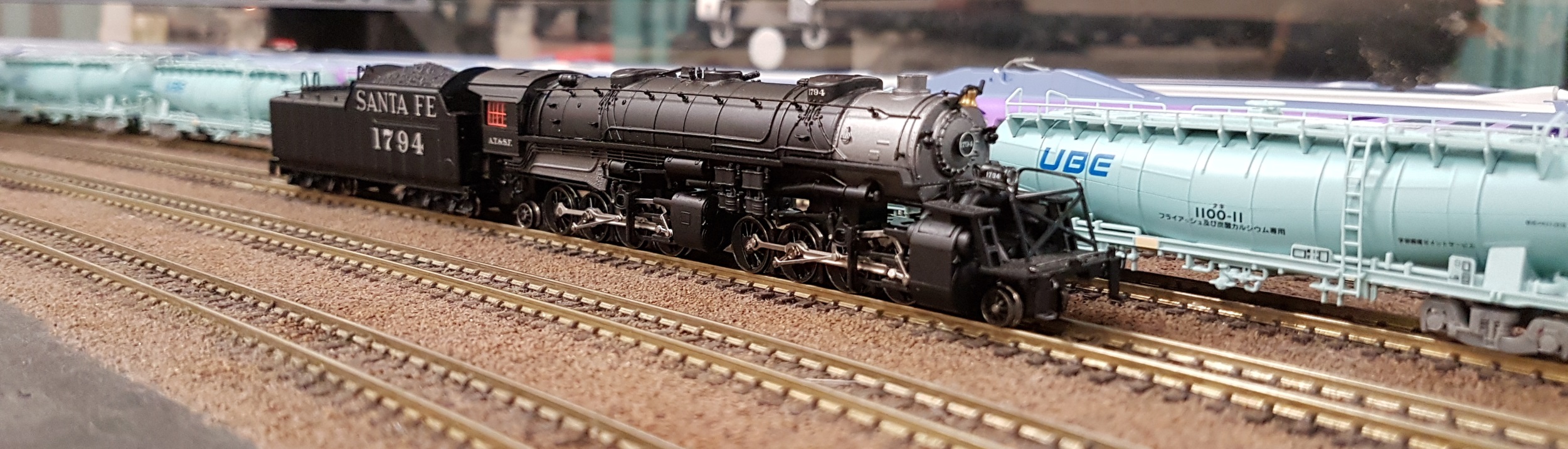 Simon’s Santa Fe (ex-Norfolk & Western) Y4 looked good, and with built in DC sound, has a large enough tender for two loudspeakers and some pretty good sound effects. A train of Paul’s Japanese tank wagons is parked behind.
