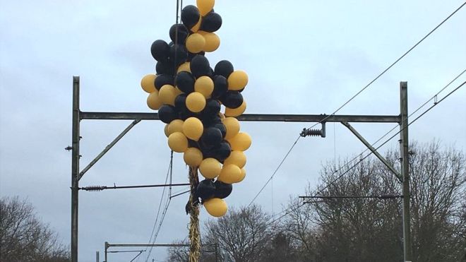 Rush-hour trains were disrupted for more than two hours by a bunch of balloons tangled on overhead lines. Commuters using Greater Anglia services were delayed in the Billericay area of Essex when about 50 yellow and black balloons got stuck.
