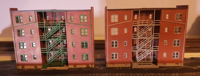 These two half-relief row houses are Walther’s kits. The left hand one was salvaged from Earl’s Wood. The right hand one is new, but the kit has been ‘in stock’ since I built the first one 10 years ago. These models go together very easily, and I built the new one in a couple of evenings – one to pre-paint most of the parts and one to put them together. A little weathering is, again, needed, but they then will be turned through 180 degrees to form a background to the modules.