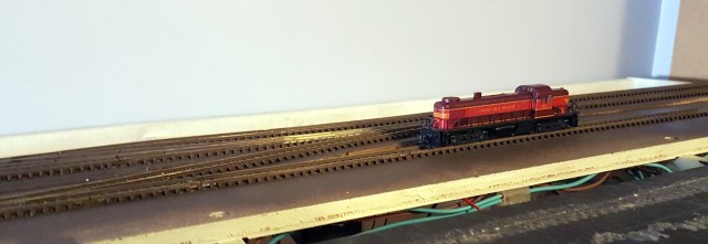 Delivery of a 450mm wide ‘half’ hollow door has provided a home for my new N-club modules – and indeed any other small layout in the future. After investing in a stud-wall detector, three large brackets support the door as a shelf. A small extension on one end fills the gap there and makes a home for the inevitable extension lead. Above are the equally inevitable blue boxes full of stock.