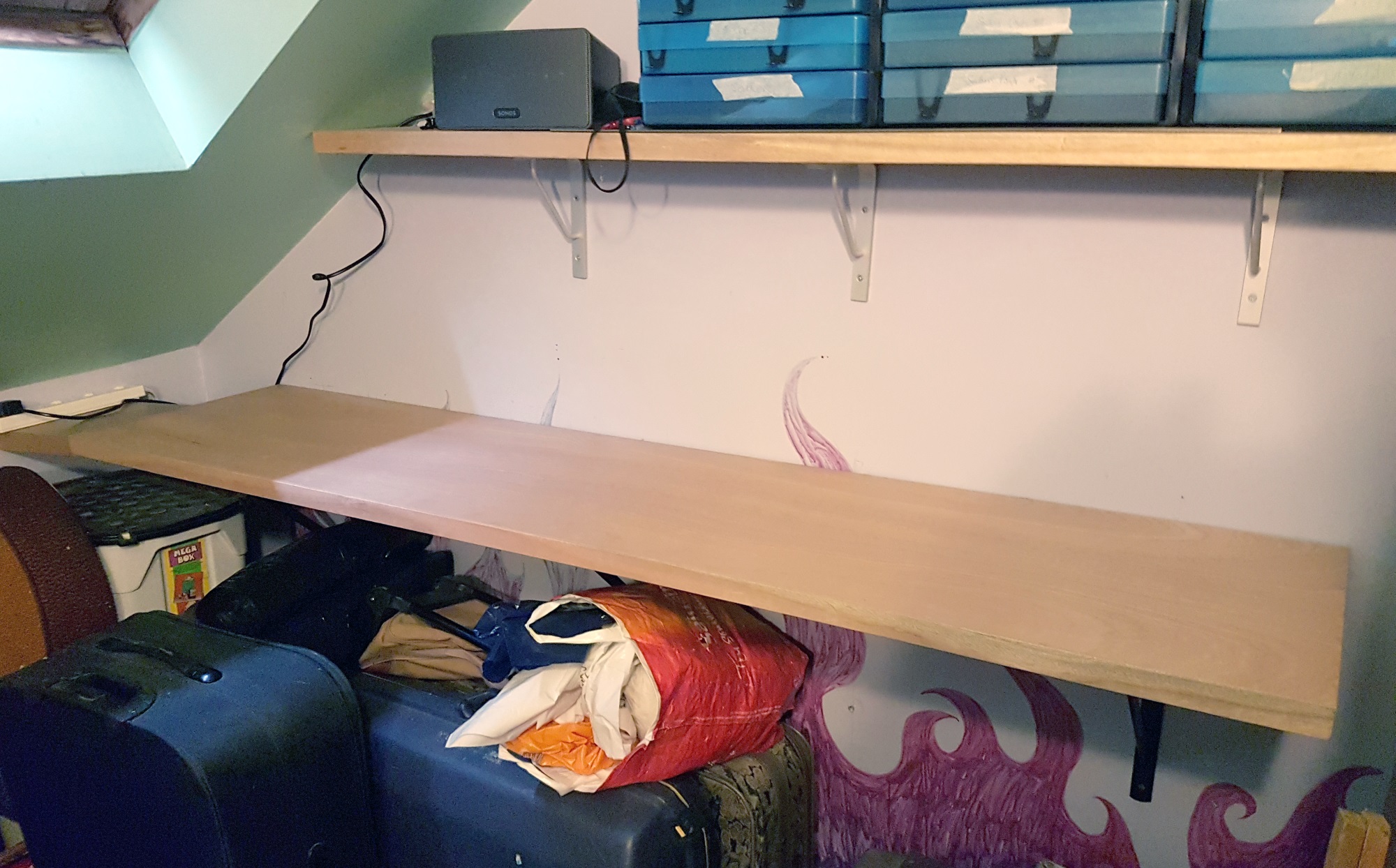 Delivery of a 450mm wide ‘half’ hollow door has provided a home for my new N-club modules – and indeed any other small layout in the future. After investing in a stud-wall detector, three large brackets support the door as a shelf. A small extension on one end fills the gap there and makes a home for the inevitable extension lead. Above are the equally inevitable blue boxes full of stock.