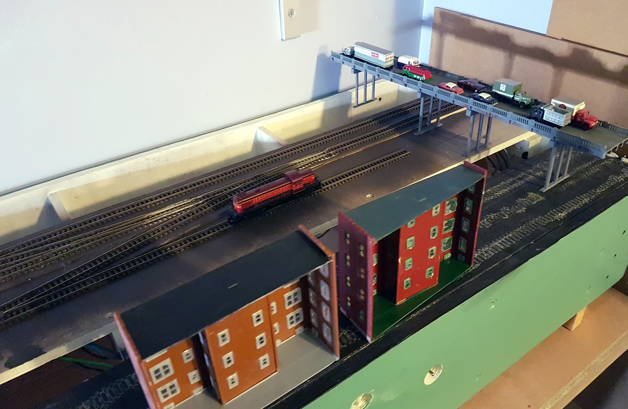 A few buildings in place gave the idea. In order to operate the point switches, the layout has had to be reversed to have the viewing side against the wall. But I think that this will OK for operation, as the buildings are all fairly low.