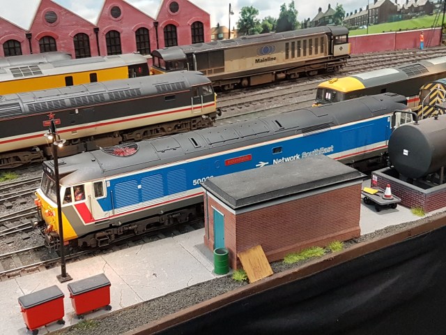Durham Road TMD followed the standard loco shed conventions that are quite common now we all have too many locomotives. But this is an excellent example of the genre, especially due to the size, being in ‘O’ gauge, and with good diesel sound. And also by the sheer number of locomotives. The fiddle yard is a small traverser, but the table next to it held a long line of locomotives, the estimated total value of which made me slightly weak at the knees. Although set it north Kent, here we have a ScotRail visitor.