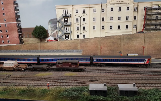 Brighton East (EM) is another good example of a Southern Region urban terminus, based on a slightly simplified version of the old Kemp Town station in Brighton. The compact, low-level, station layout and the tunnel mouth at the end of the station are just like Kemp Town. The only thing I wasn’t convinced about was the nuclear flask wagon parked by the platforms! Must have got lost on the way to Dungeness…..