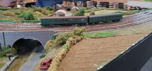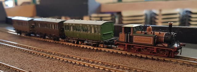 We were considering doing a ‘special’ Terrier as ‘Earlswood’, but Dapol then released it as one of their liveries. Derek’s model is hauling three German coaches, that make reasonable UK 4-wheelers with little effort.