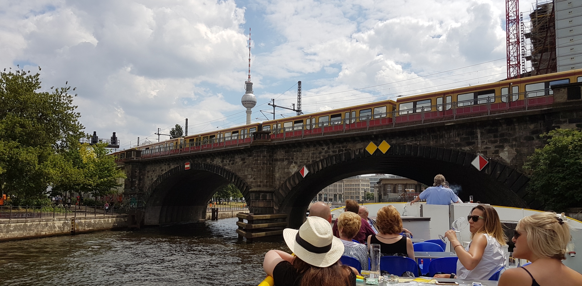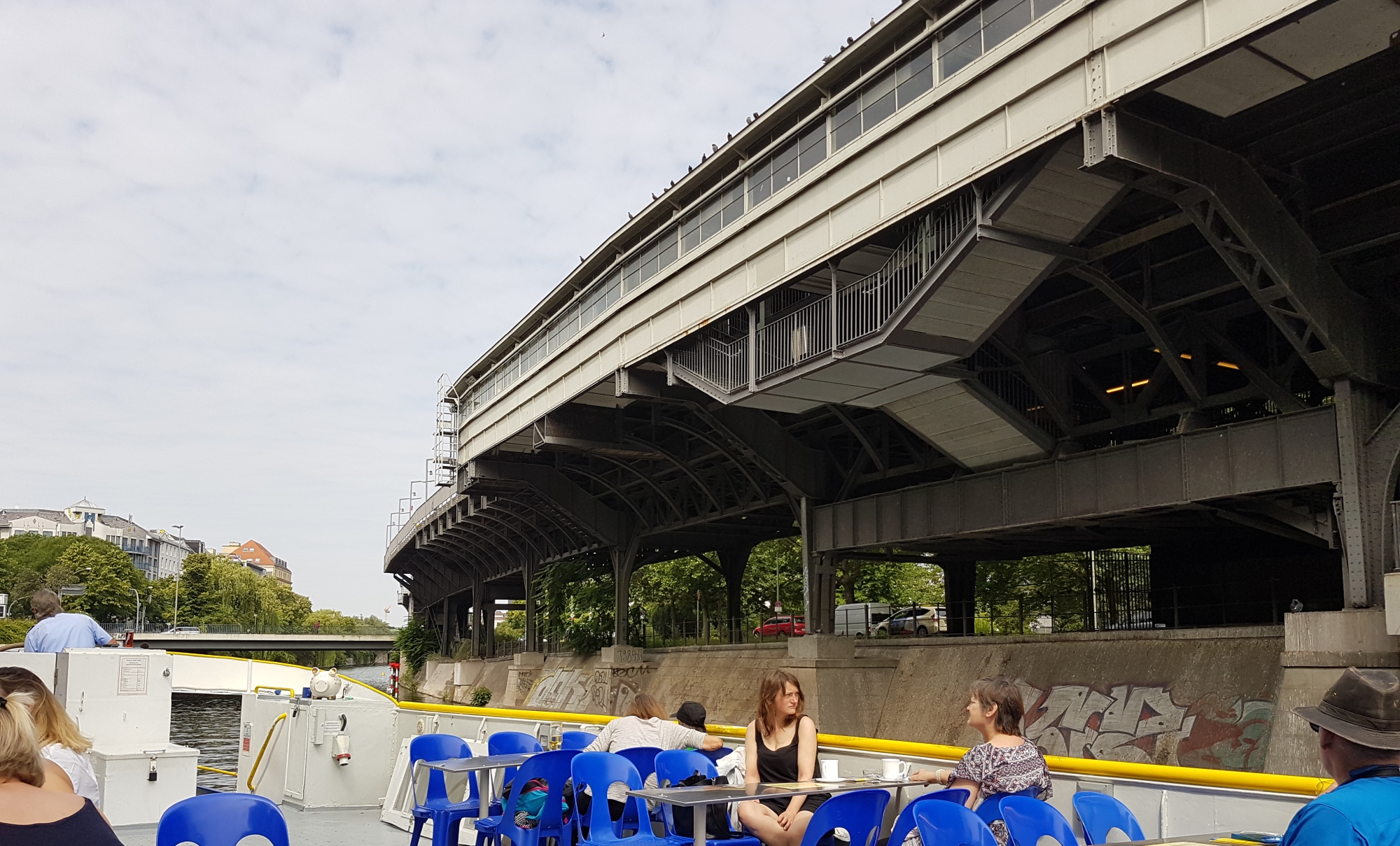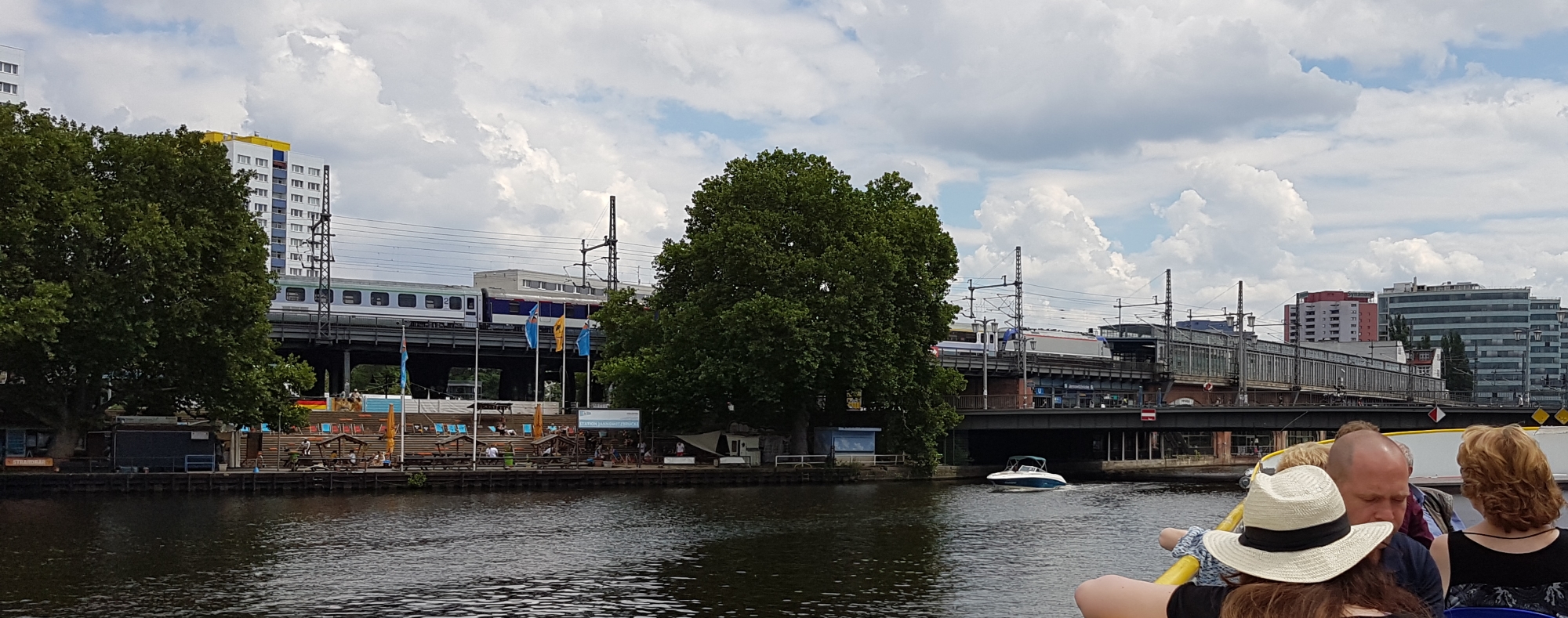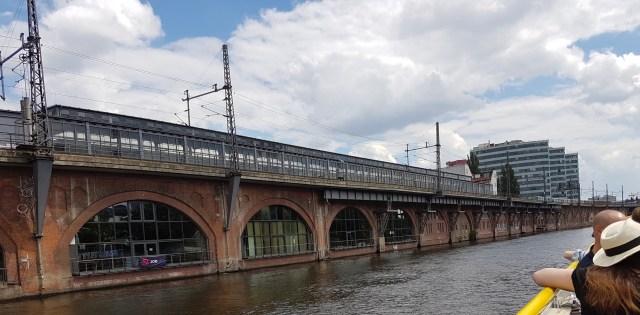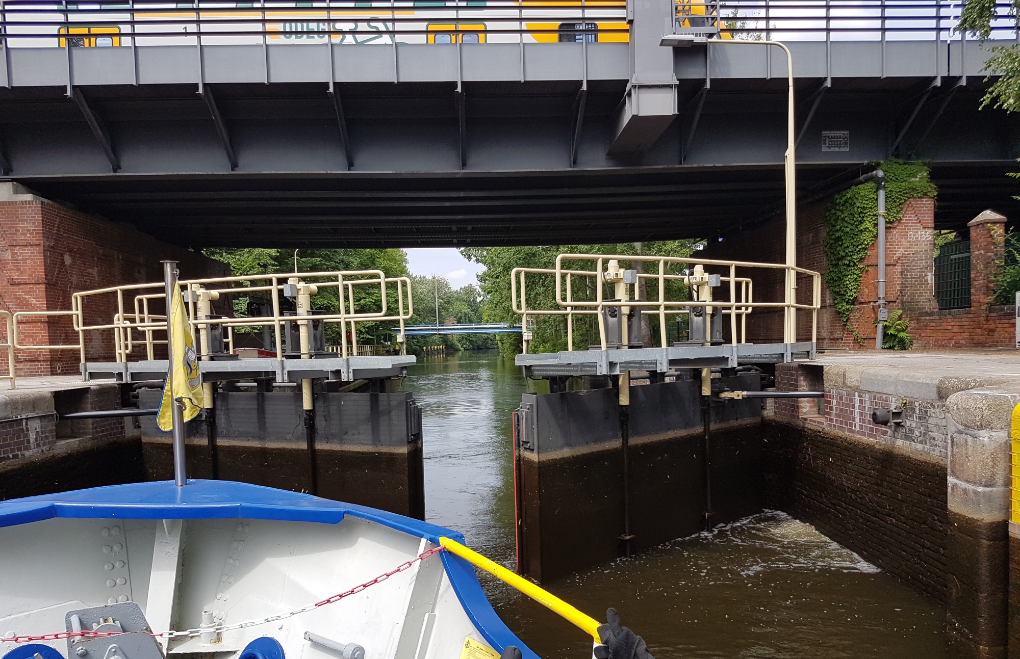 Three locks on the trip (two on the canal and a large one on the Spree) were very interesting to watch in operation. A local train passes overhead here….