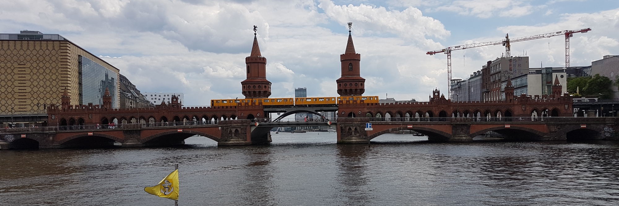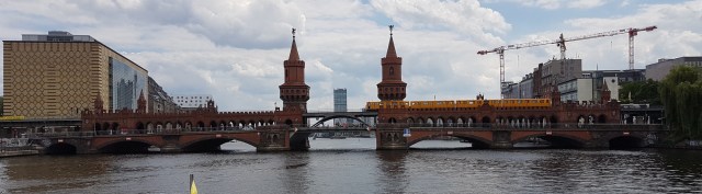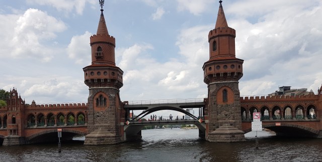 The Oberbaum Bridge (Oberbaumbrücke) is a city landmark, a double-deck bridge crossing the Spree. Road crosses at low level, the U-Bahn above. The Berlin wall ran along the left bank in the photo below.