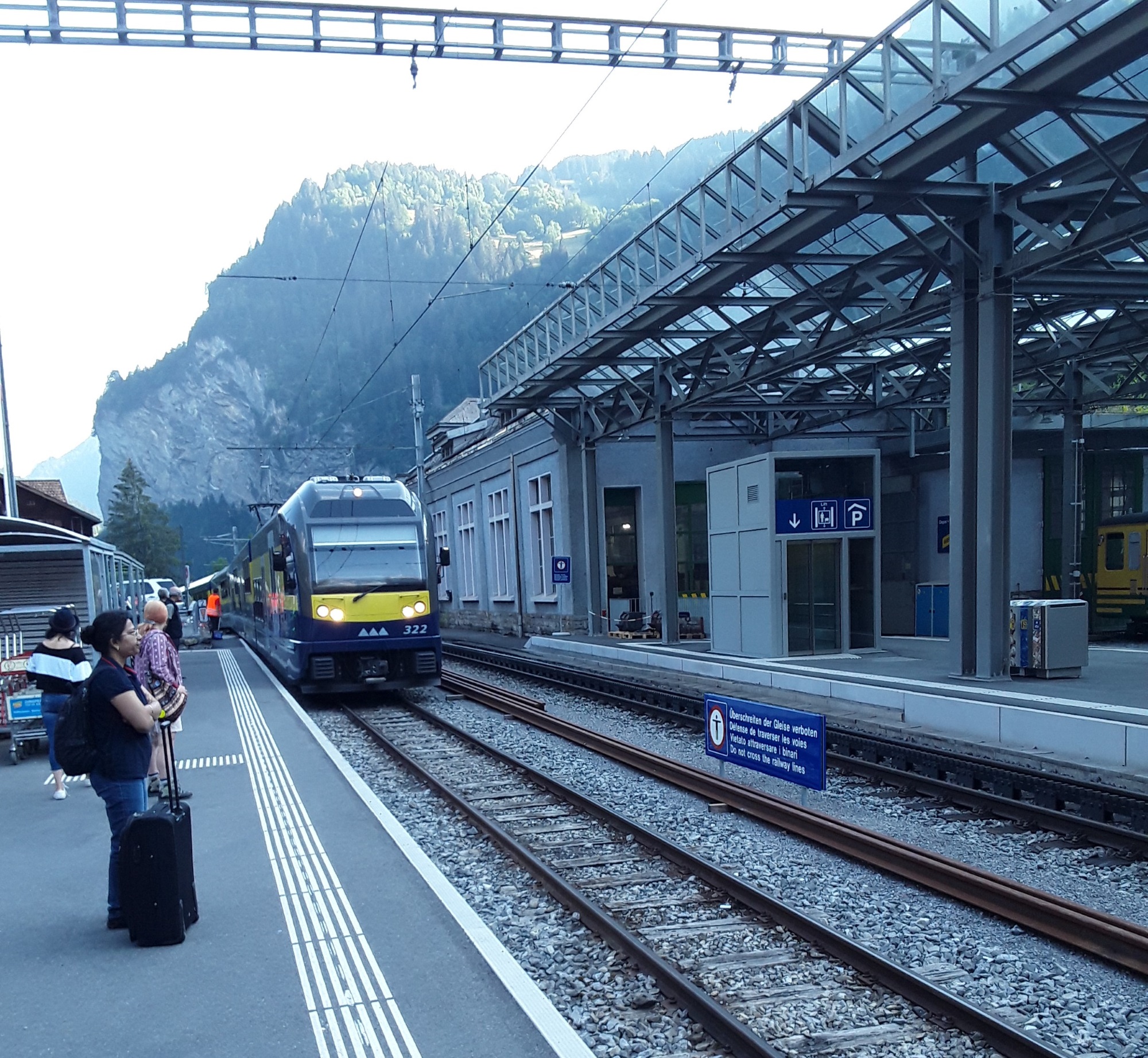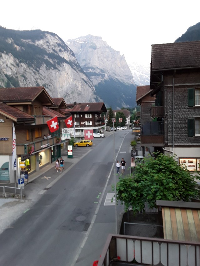 Flew out today. We landed 2 hours late at Basle due to technical problems before onward flight to Gatwick and then problem agreeing baggage with customers. We therefore arrived in Lauterbrunnen at 8pm local time. SBB app told us next train was at 1750 but we caught one at 1720 changing at Spiez for Interlaken. Attached are photos taken from our hotel balcony.
