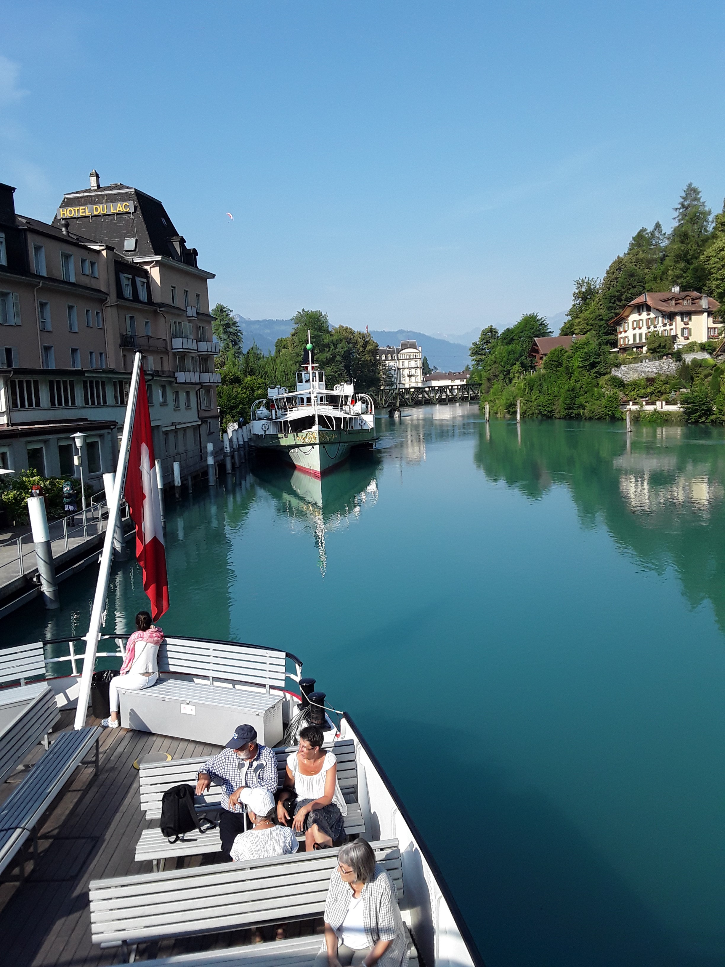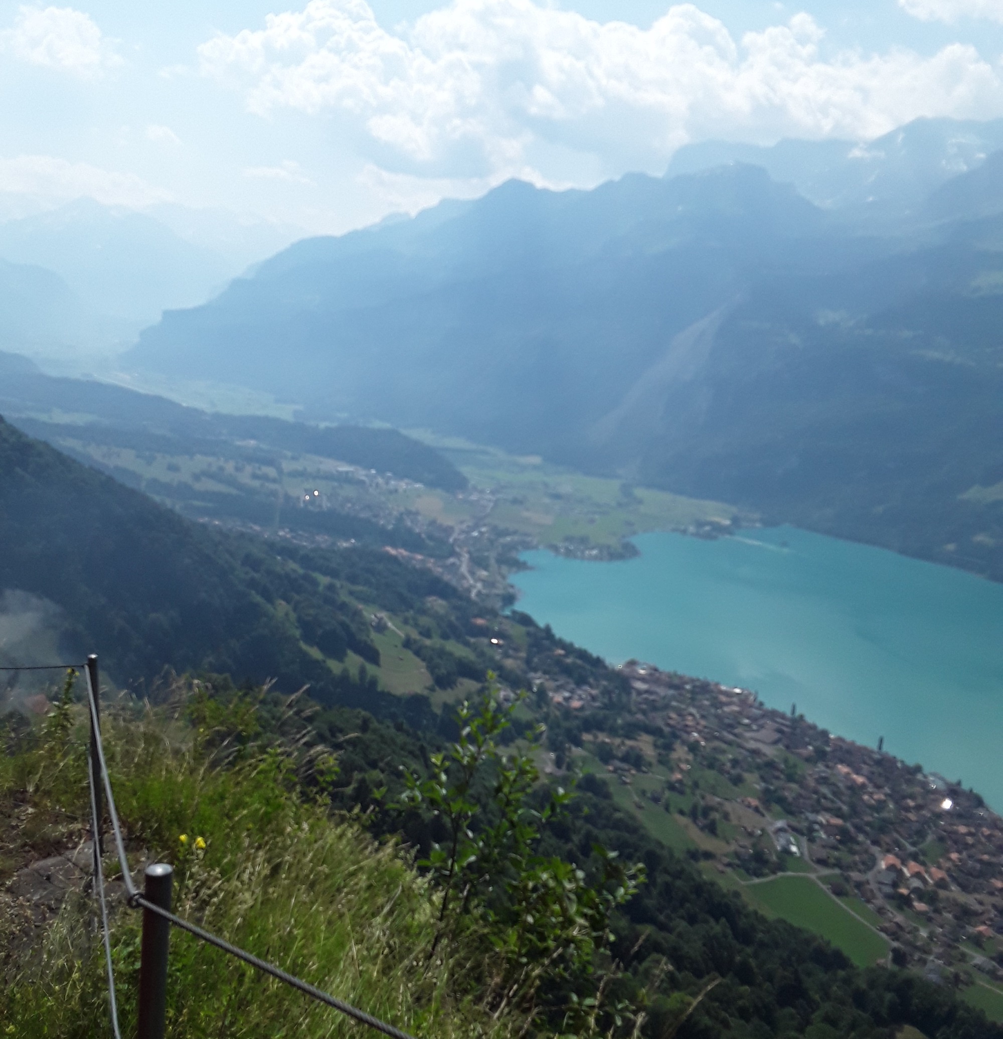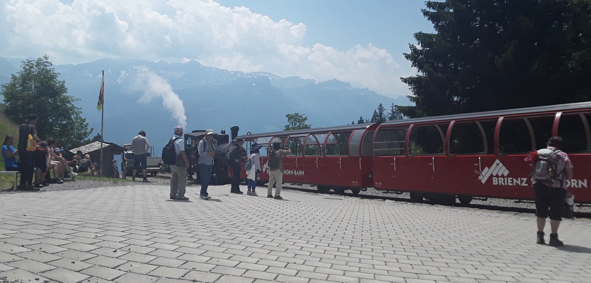 A hot and eventful day. Set off this morning for Interlaken Ost and took first boat to Brienz for trip on Brienz Rothorn Bahn. Journey up went well but on way down our steam loco stopped halfway for a while and then stopped at Planalp and let train following us and a diesel hauled works train to pass us. We were told to leave the train as the loco had failed. The diesel pushed its wagon in front of us whilst our steamer pushed the empty carriages up out of the passing loop and then eased back towards the wagon. The diesel then ran round to collect our carriages and bring them back into station to pick us up and take us down to Brienz.