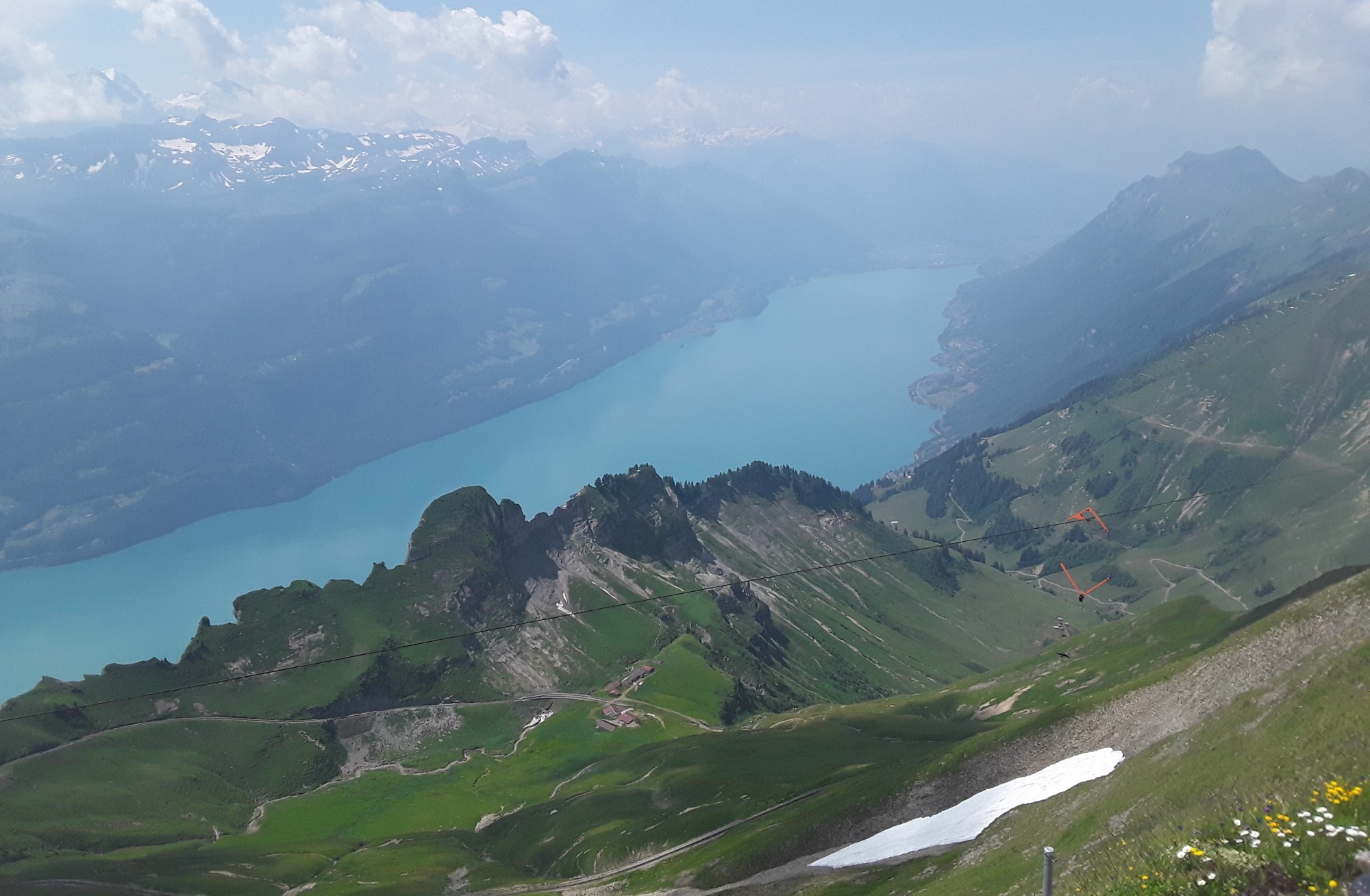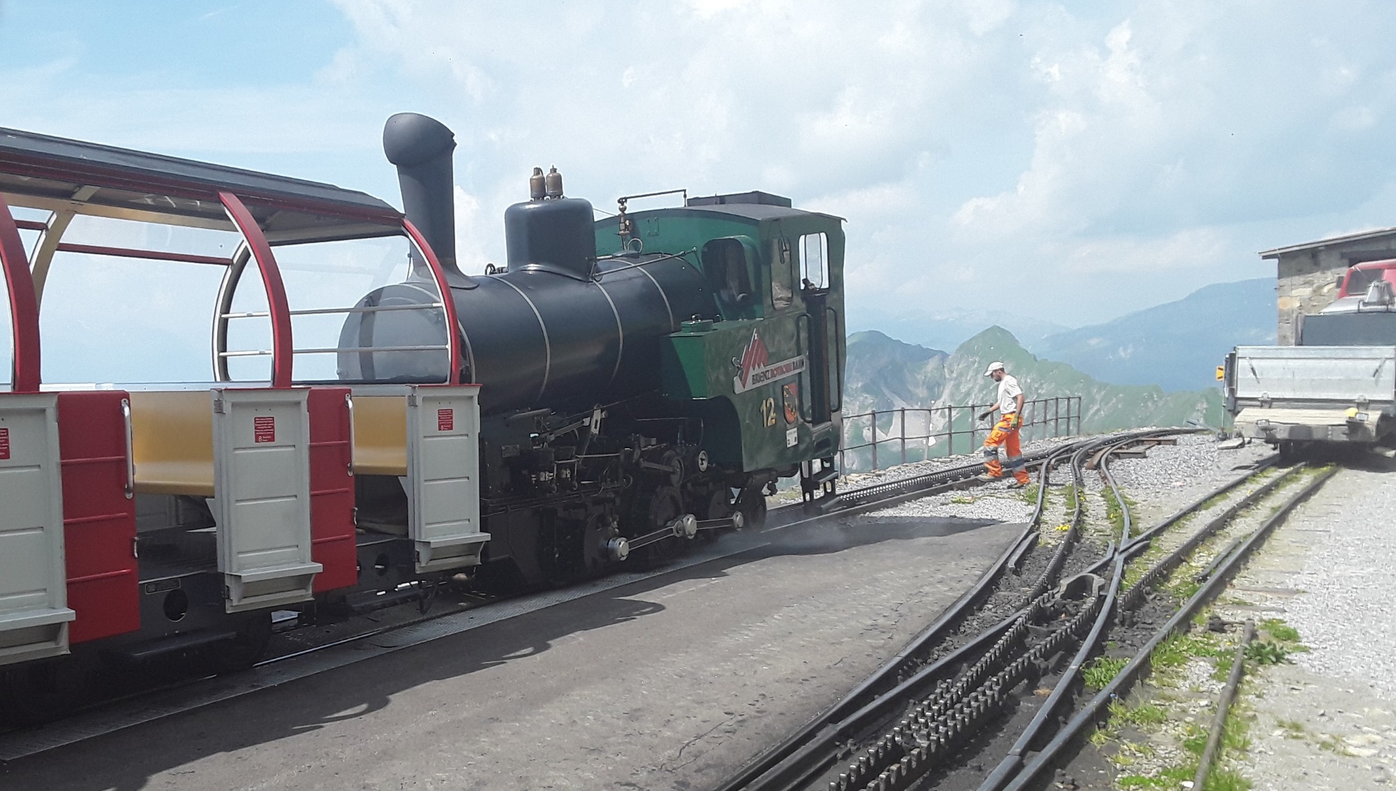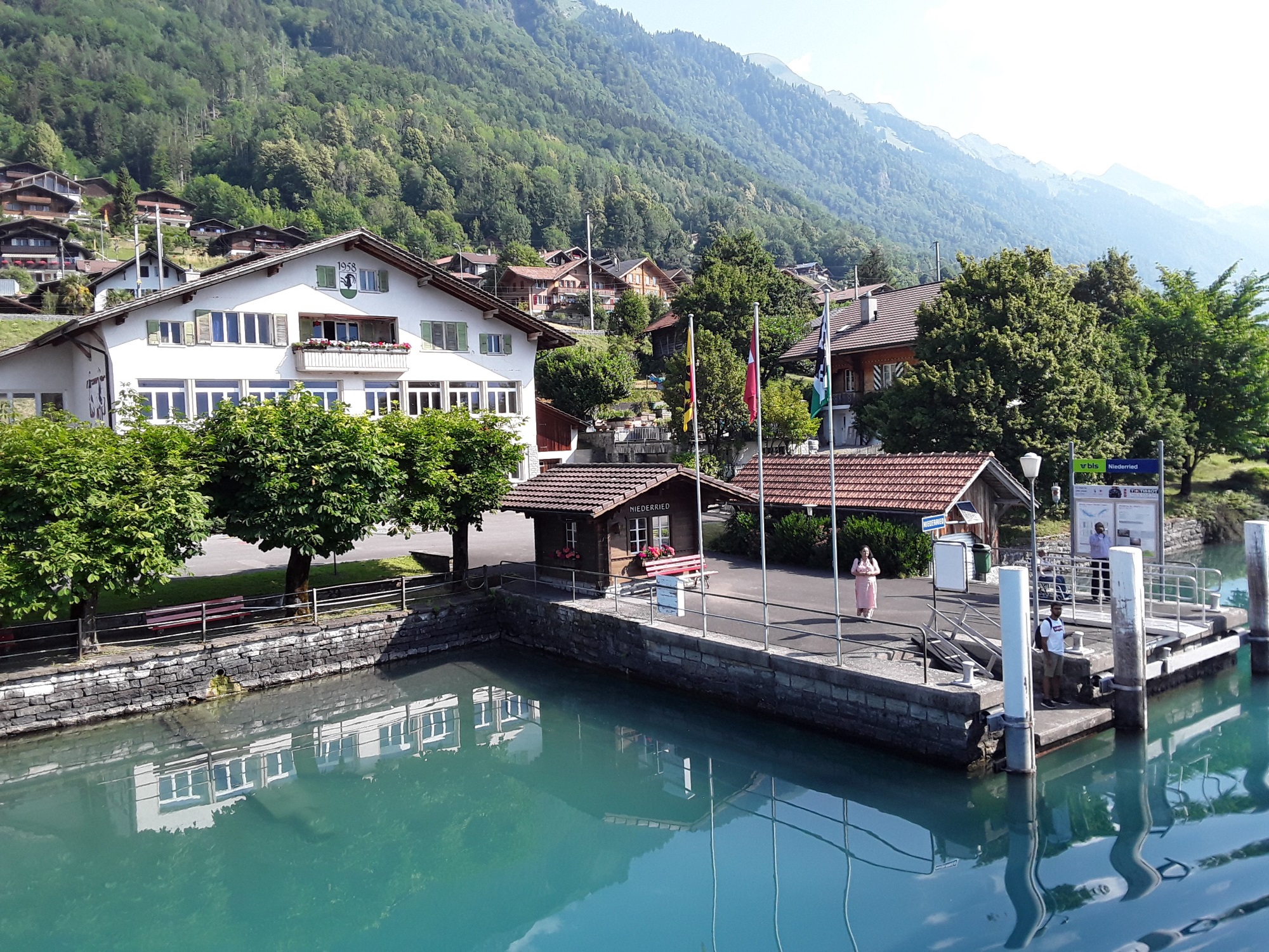 A hot and eventful day. Set off this morning for Interlaken Ost and took first boat to Brienz for trip on Brienz Rothorn Bahn. Journey up went well but on way down our steam loco stopped halfway for a while and then stopped at Planalp and let train following us and a diesel hauled works train to pass us. We were told to leave the train as the loco had failed. The diesel pushed its wagon in front of us whilst our steamer pushed the empty carriages up out of the passing loop and then eased back towards the wagon. The diesel then ran round to collect our carriages and bring them back into station to pick us up and take us down to Brienz.