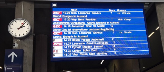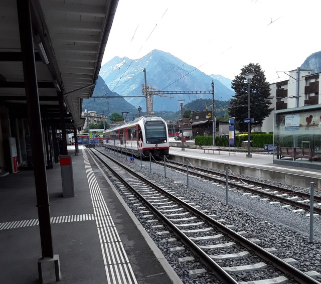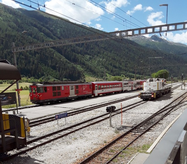 Left hotel this morning in heavy drizzle but within a few hours it turned into another hot day. We travelled by train via Interlaken to Meiringen. From there we took postbus over the Grimsel Pass, where we had a 30 minute break, to Oberwald. We then returned by train to Brig for train over original Lotschberg route to Spied and then back to hotel via Interlaken.
