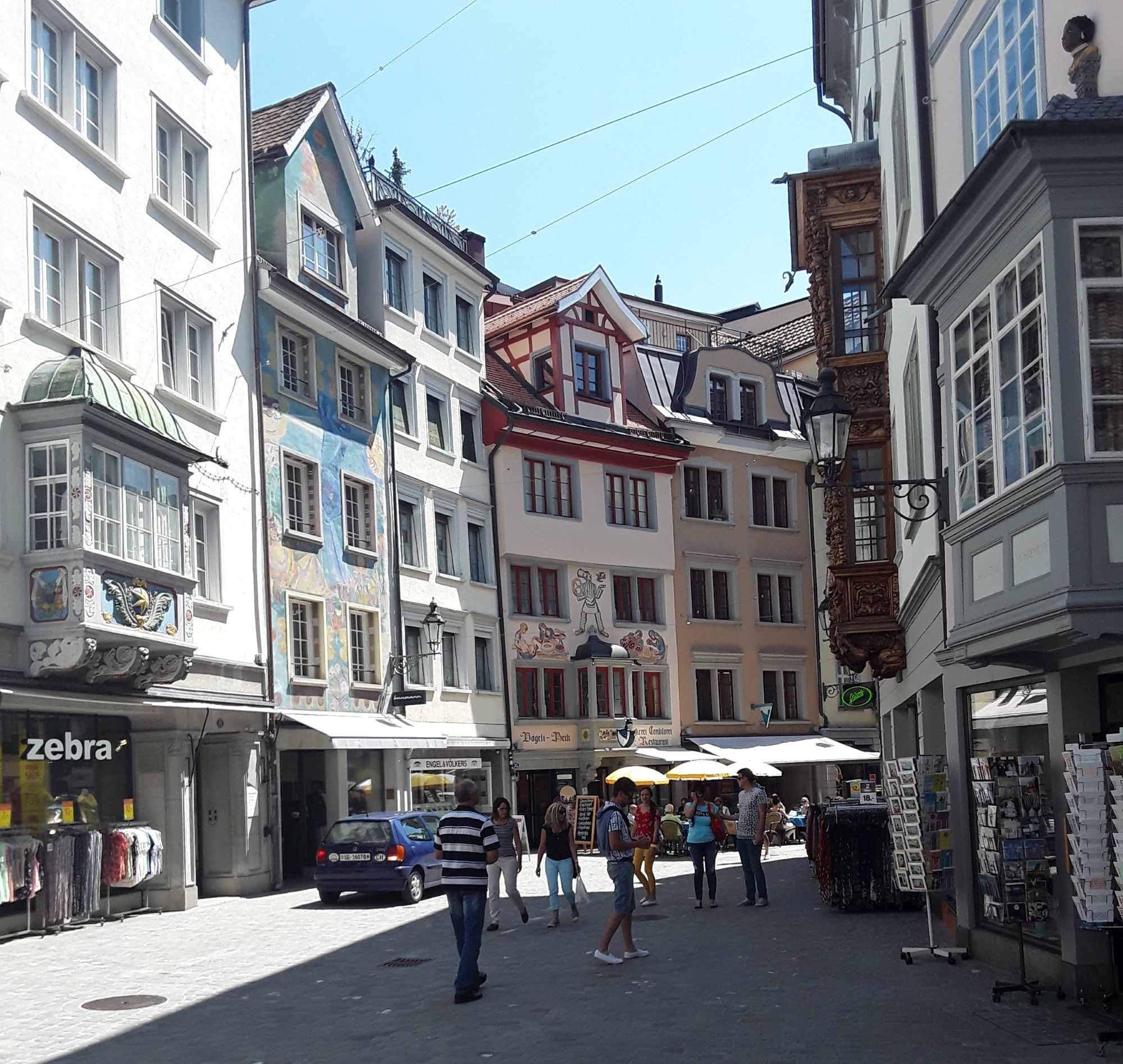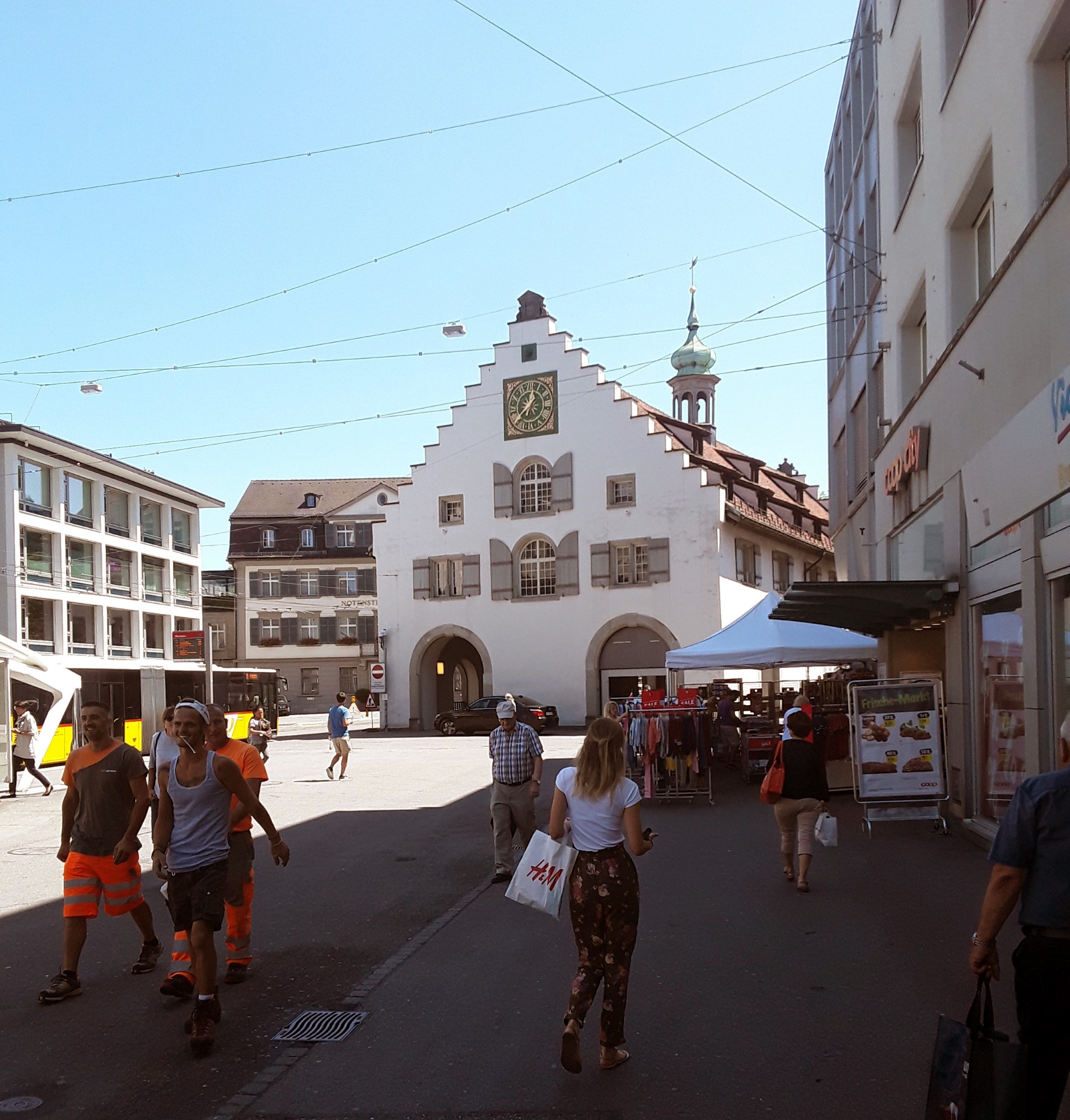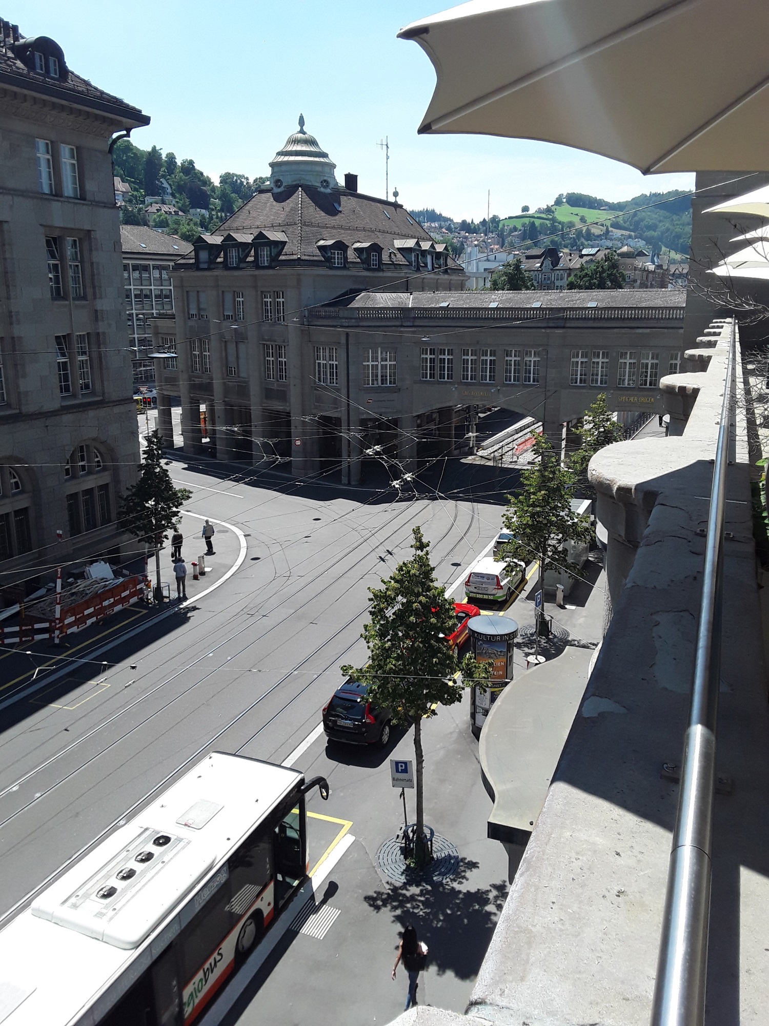Another sunny day. Today was an out and back journey by train to St Gallen. When we got there we visited the large model shop but Allan found nothing he wanted. Then Allan returned to station to do some grieving whilst Ron went for a walk round town and do some shopping. We met up got a late lunch time snack on the balcony of the Mirror Restaurant which is above the station.