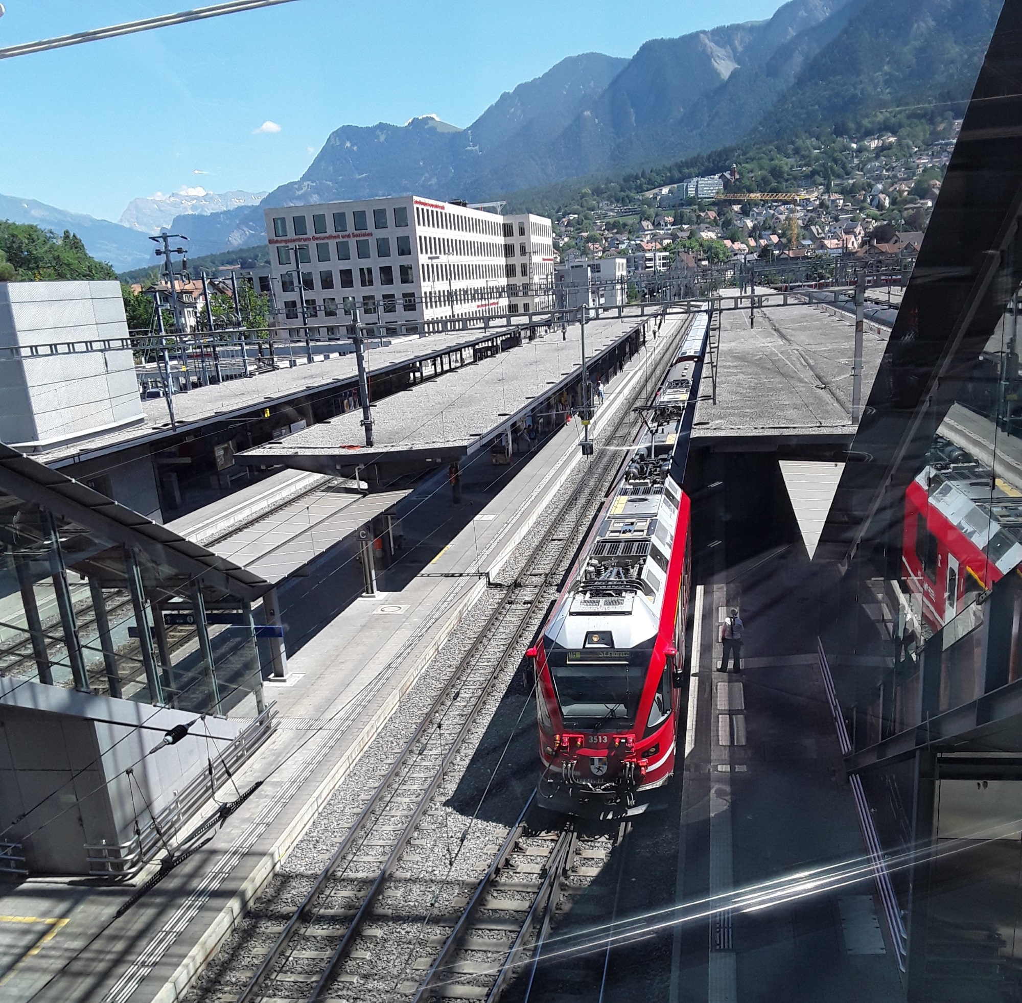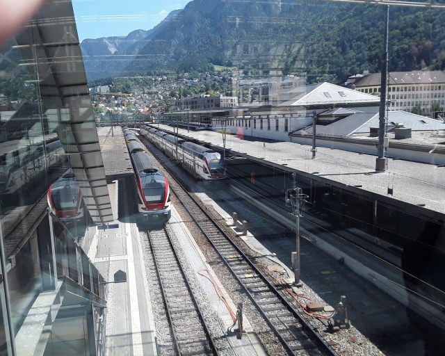 Another scorcher. Rode on more postbusas than trains. Took trains to Ilanz changing at Reichenau Ramins. From Ilanz we made our way by postbus as to Davos changing at Laax, Chur and Tiefencastel. We took the nostalgia train back to Filisur. Luckily we got seats in one of the open air panoramic wagon but unfortunately the Crocodile was not at Davos to pull the train.