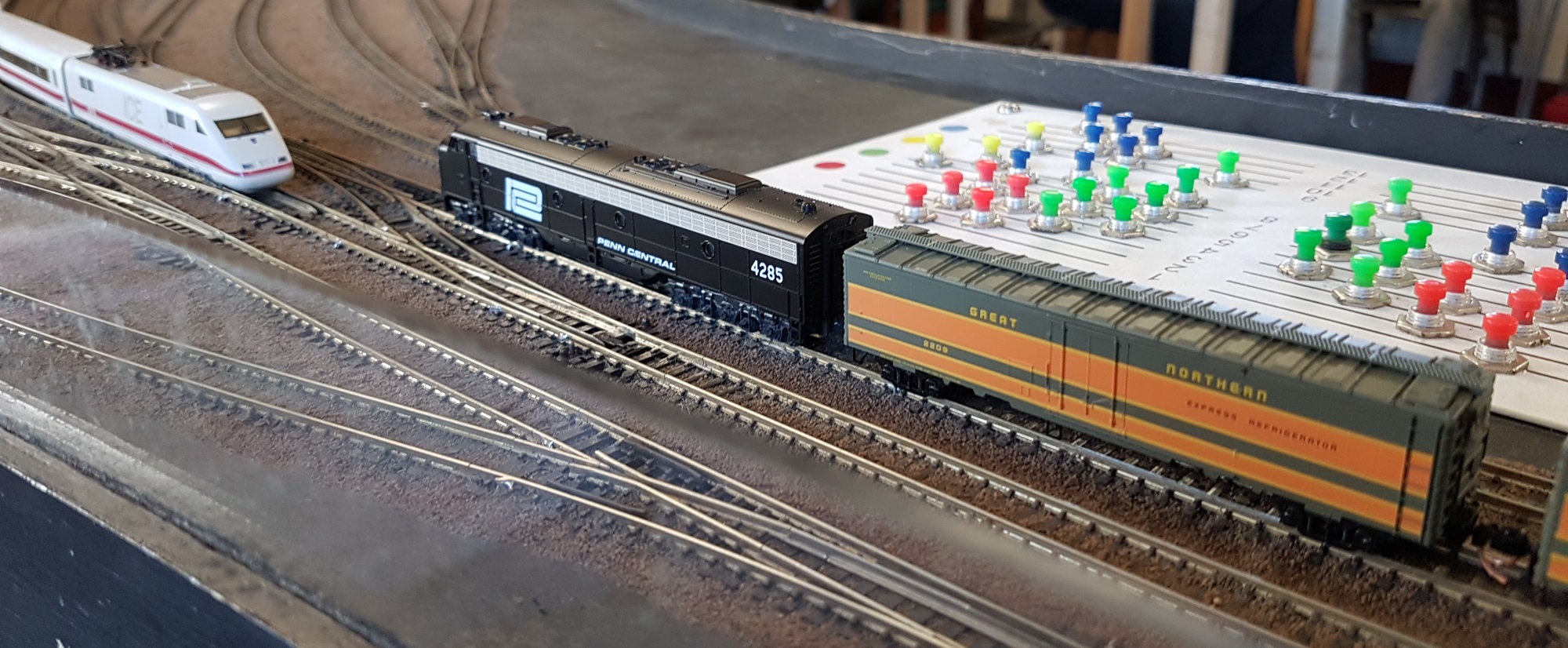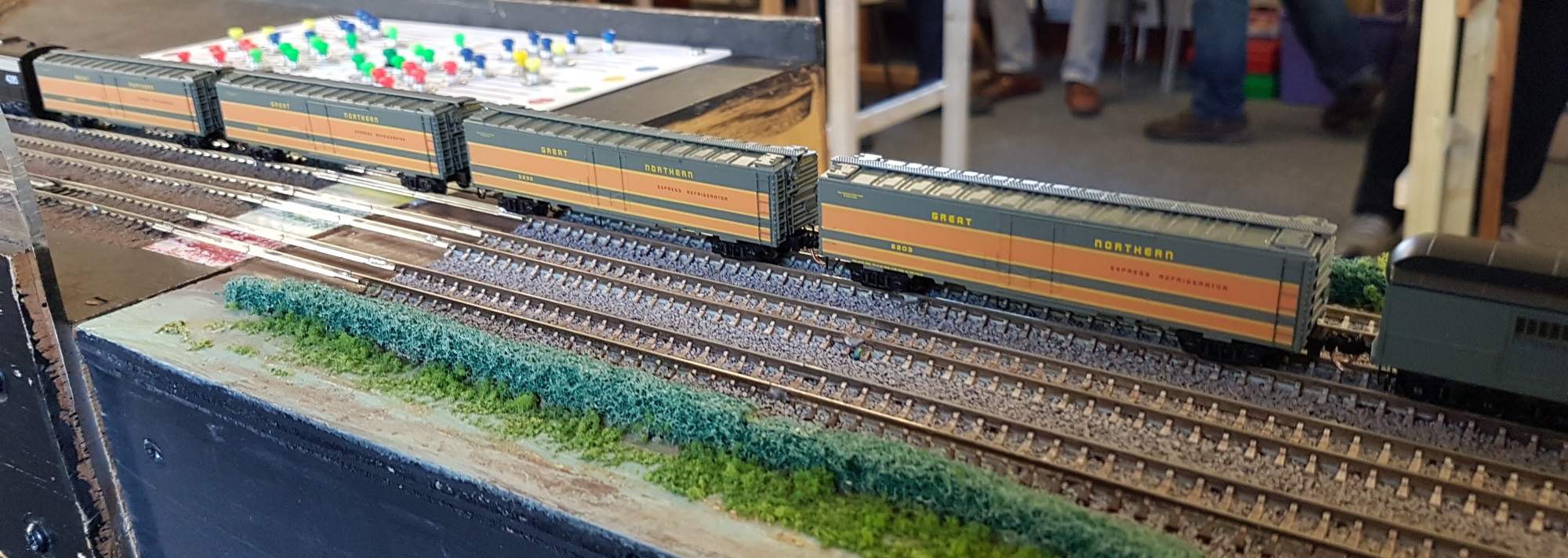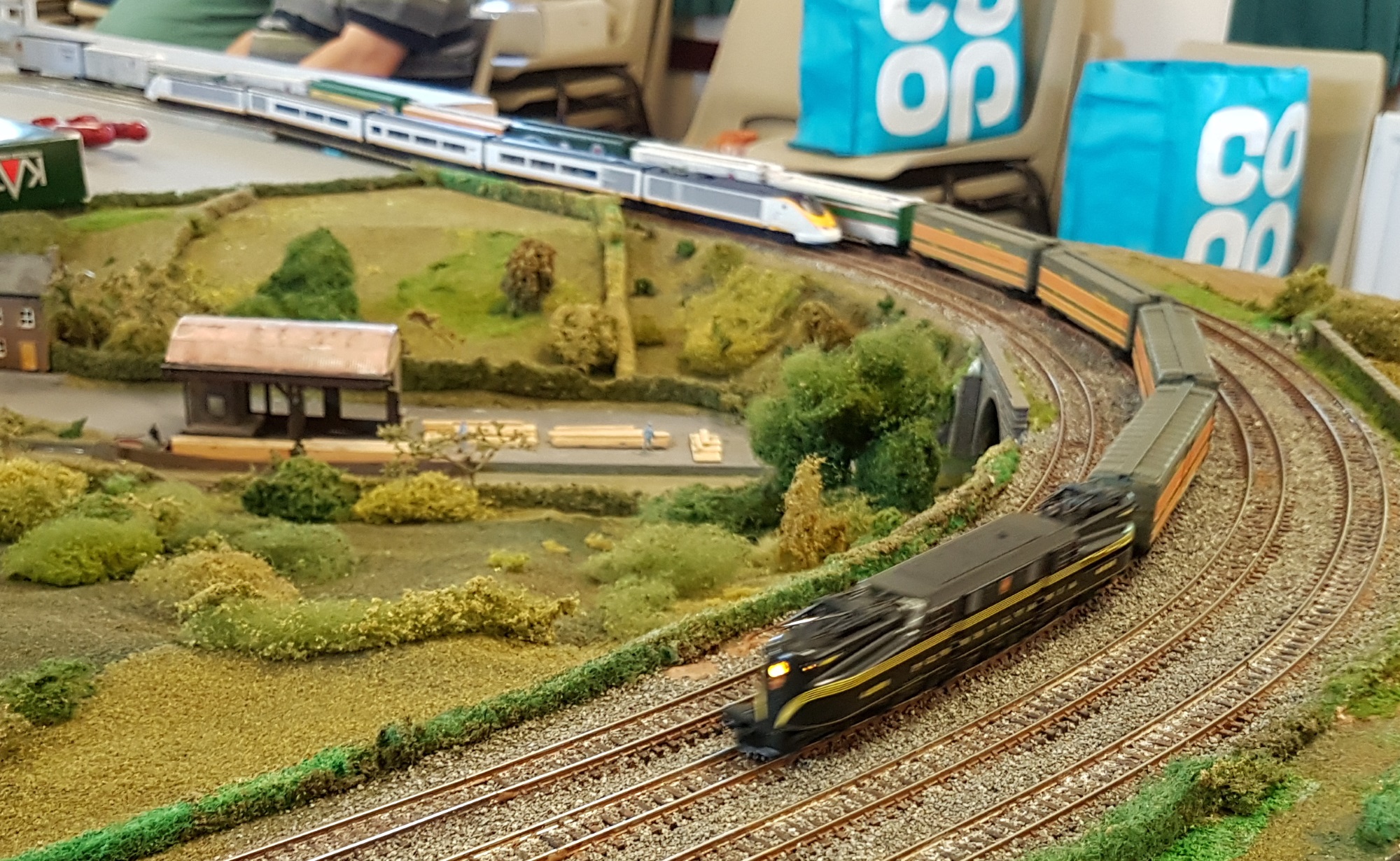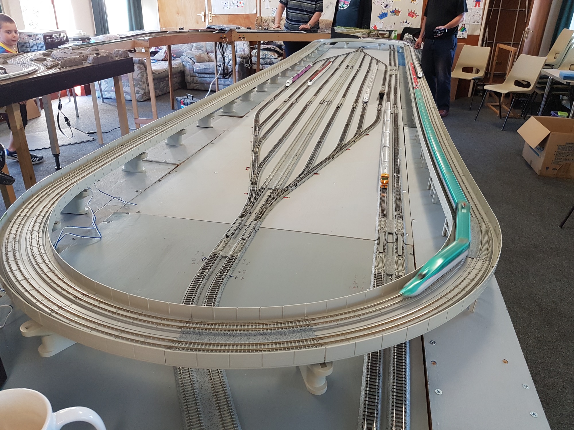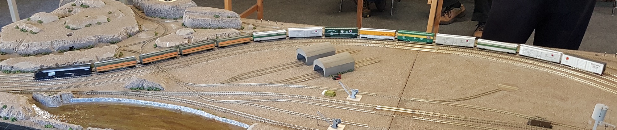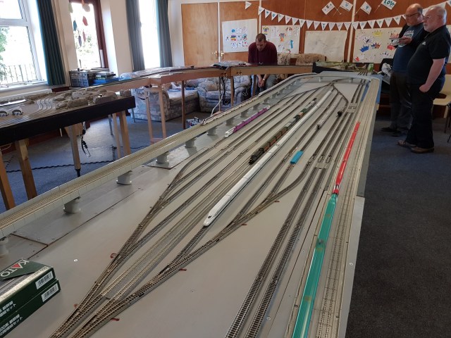 Meanwhile, Paul brought along his Kato modules, so we had a 25′ x 9′ layout to run on…