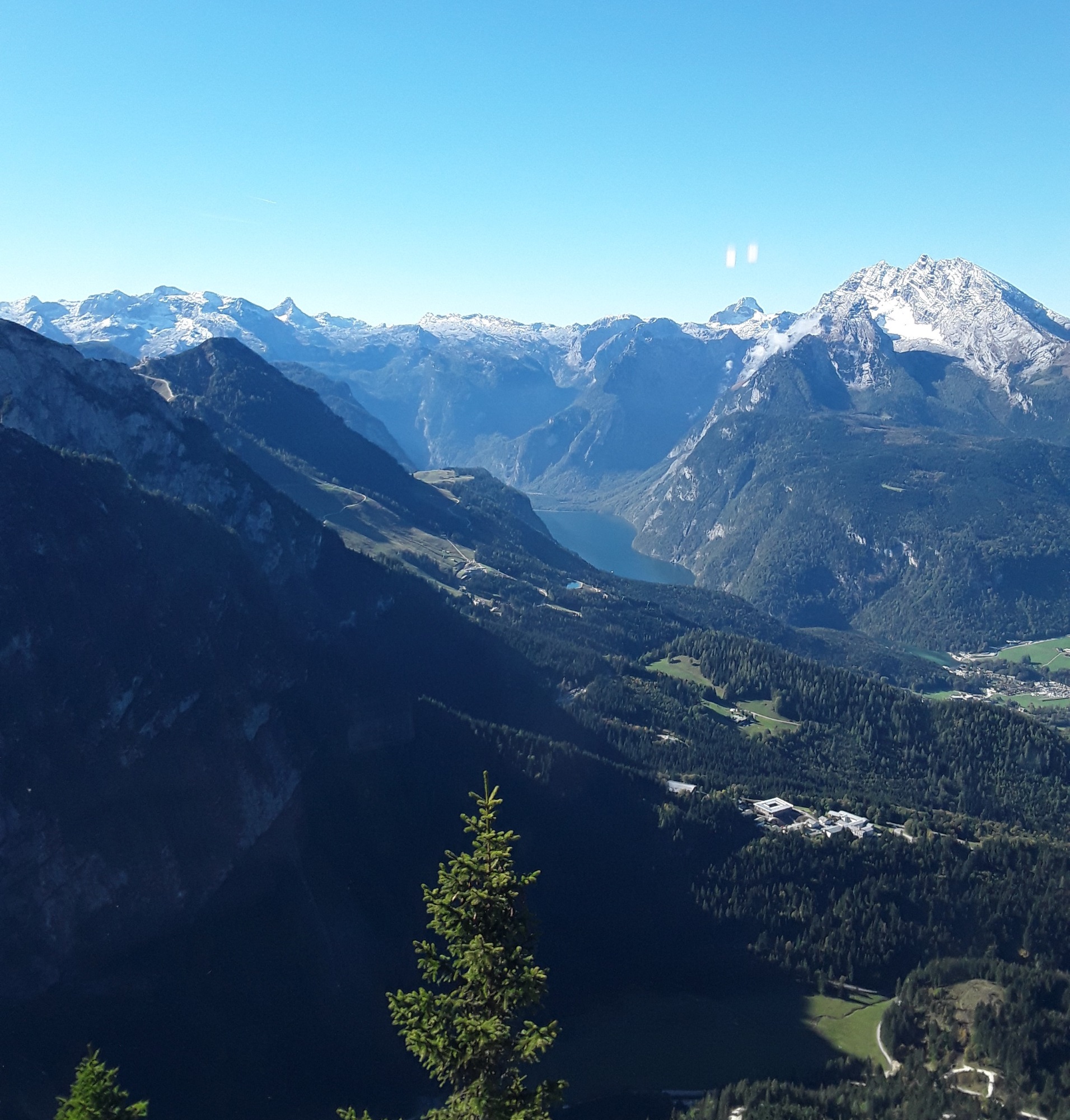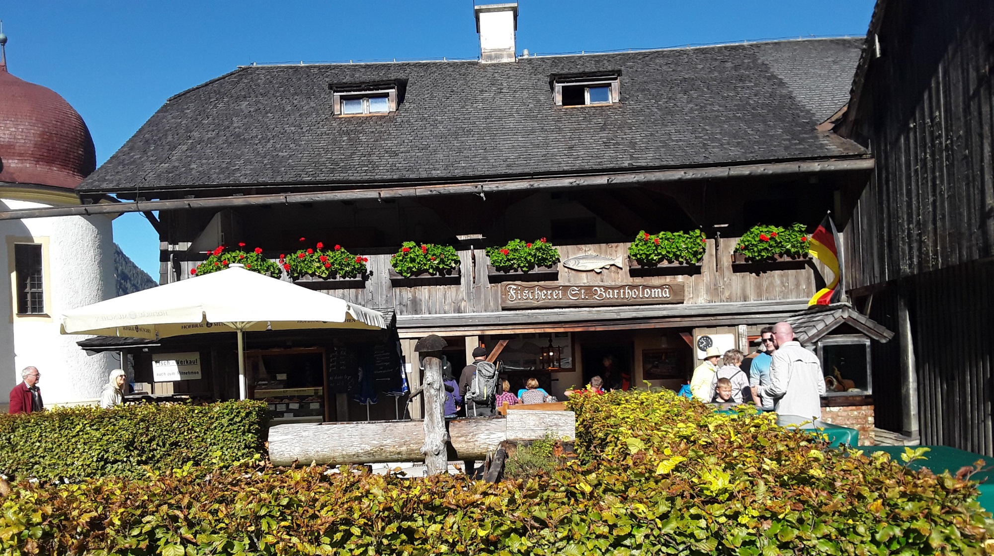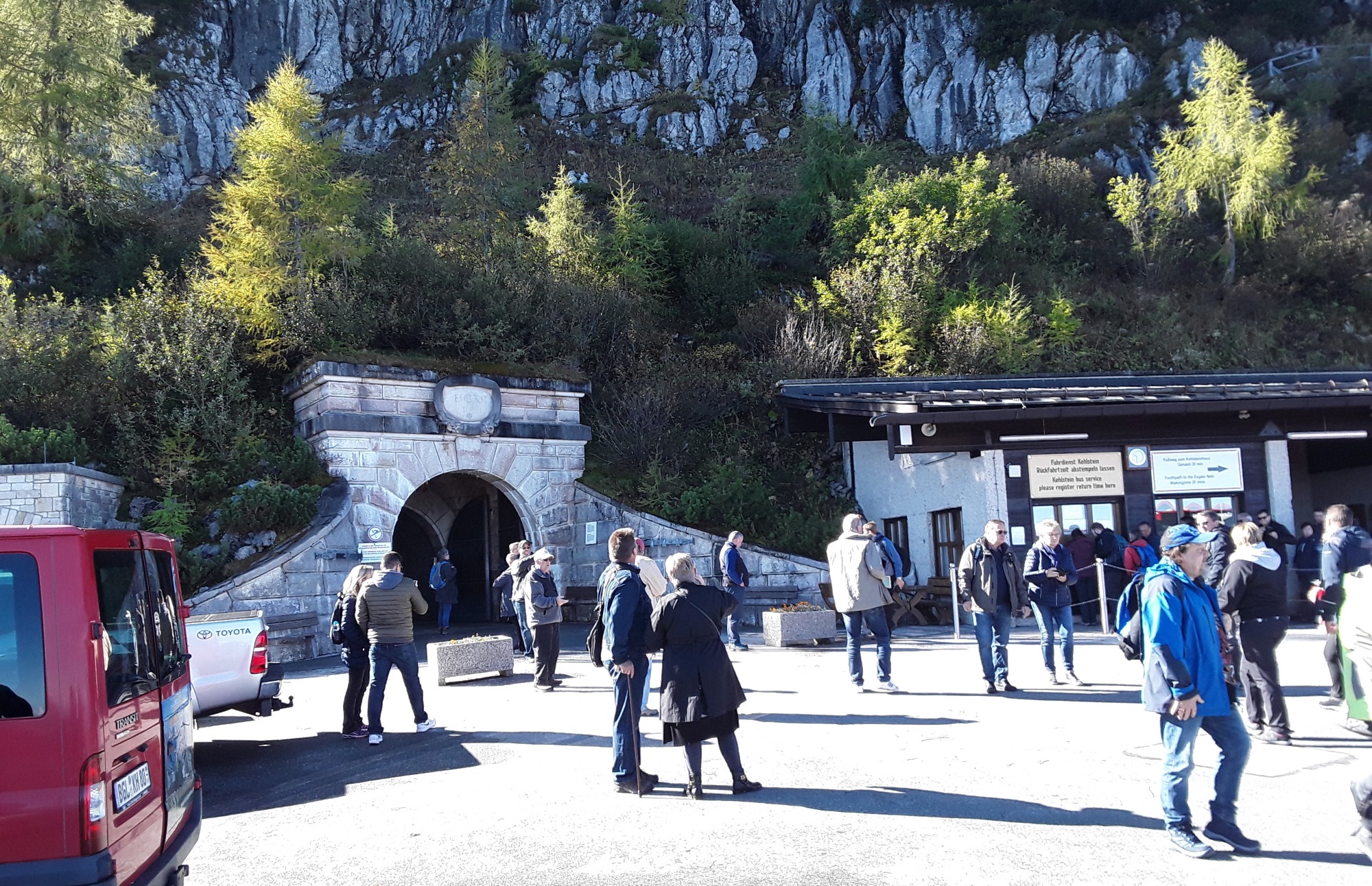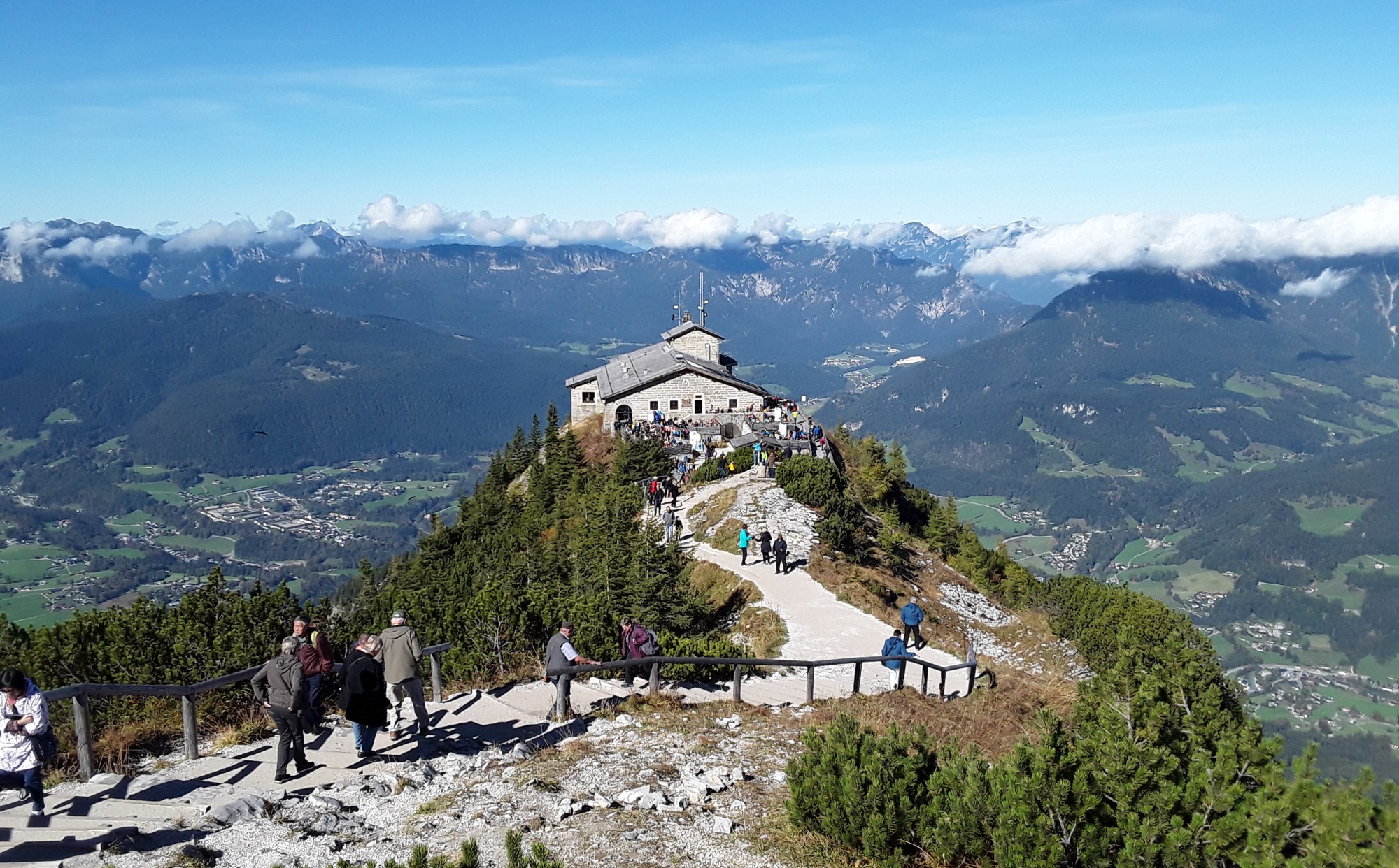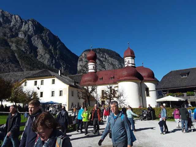 A misty start turning into a warm sunny day. Full day today. In the morning we went by coach to Berchtesgarten to visit the infamous Eagles Nest. Contrary to popular belief nobody stayed there overnight as it was a Nazi conference and entertainment centre. Hitler only visited 14 times due to his claustrophobia and fear of heights and stayed further down at the Berghof. It was at this site we had to leave the coach and transfer to a specially adapted bus to travel up a mountain road to an upper car park where you walk down a 124m tunnel to a polished brass lift to take you up to the building. Afterwards we went to Konigsee for a return trip on the lake to St Bartholema. Then back to hotel.