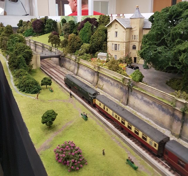 Perhaps my favourite layout was Sydney Gardens in OO. But perhaps that is a function of my layout design thinking at the moment! A simple continuous double tracked run fed a stream of trains past the observed. Where this layout stood out was that (a) it accurately depicts the double-track Great Western main line through the famous Sydney Gardens in the City of Bath, and (b) the modelling is exceptionally good – look at the large house below and the weathering on the retaining wall.
