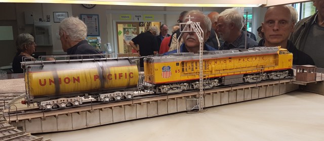 And finally, Laramie Engine Shed in O-gauge (the USA version). It models part of the Union Pacific Engine Terminal at Laramie, Wyoming. I’ve seen this layout a number of times, but the lack of barriers this time allowed some close up inspection of some very good modelling. Which ESNG member does the gentleman in the second photograph remind you of? (Sorry, no prizes.)