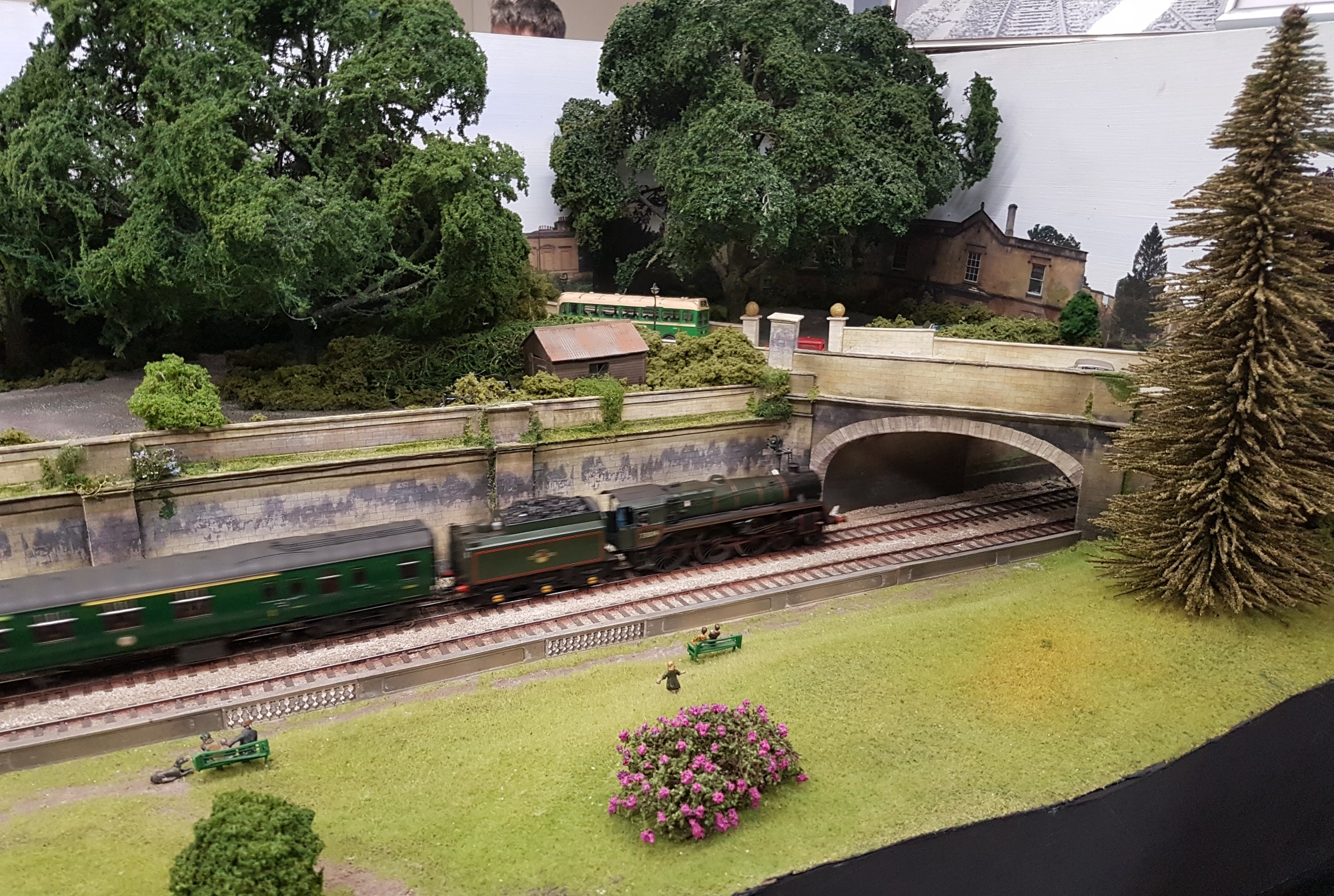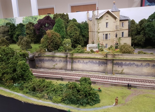 Perhaps my favourite layout was Sydney Gardens in OO. But perhaps that is a function of my layout design thinking at the moment! A simple continuous double tracked run fed a stream of trains past the observed. Where this layout stood out was that (a) it accurately depicts the double-track Great Western main line through the famous Sydney Gardens in the City of Bath, and (b) the modelling is exceptionally good – look at the large house below and the weathering on the retaining wall.