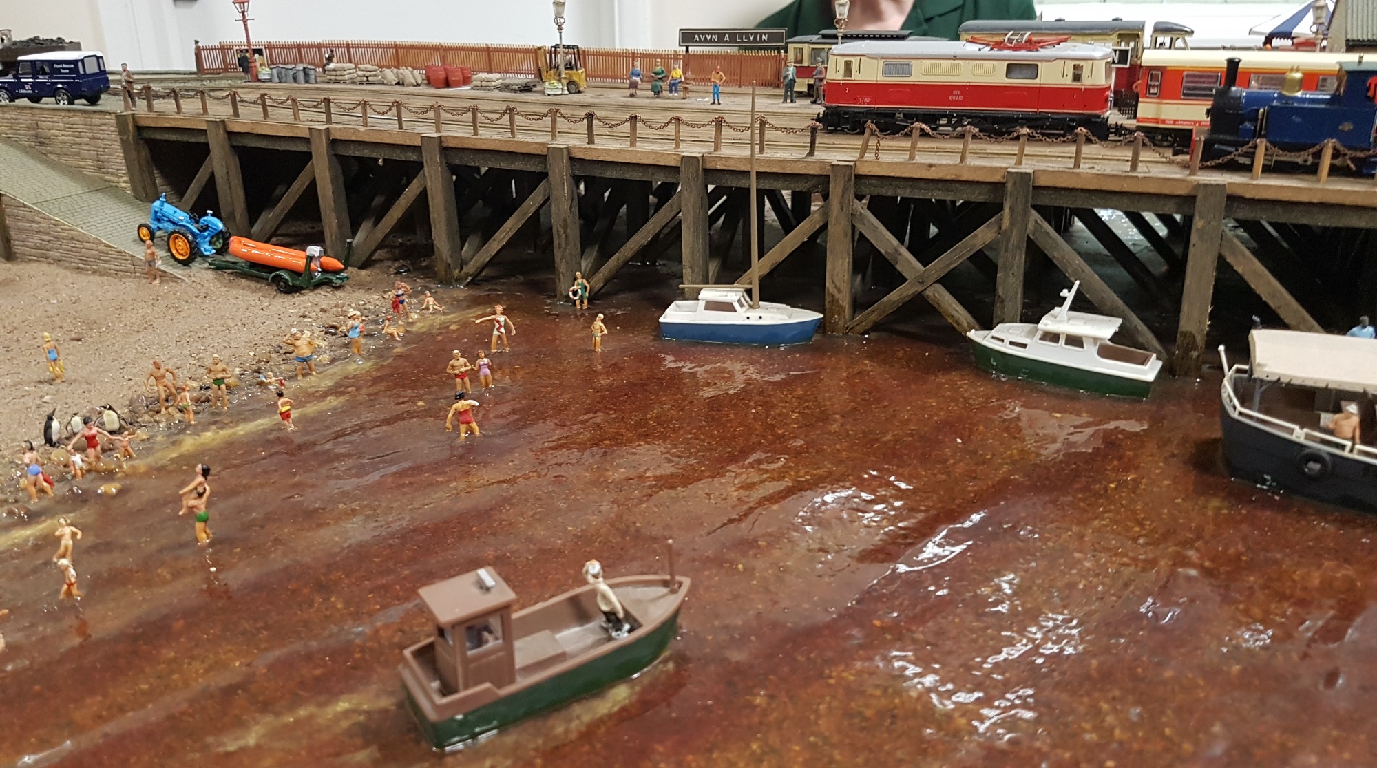 Avyn-A-Llyin, in 009 is vaguely Welsh (hence the name) but all sorts of stock runs. I suppose that is no different from Welsh preservation lines these days! A major feature is the beach and sea, and more 4mm flesh on a layout than I’ve ever seen before. (Fortunately, most of it was modestly covered in the right places.)