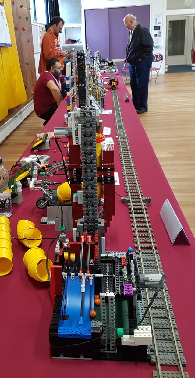 Down the other wall was the ‘adult’ Lego display, with a wonderful mechanism that transferred small balls from one end of the mechanism to the other, then returned them on the train. A fascinating bit of work, that worked well all day.