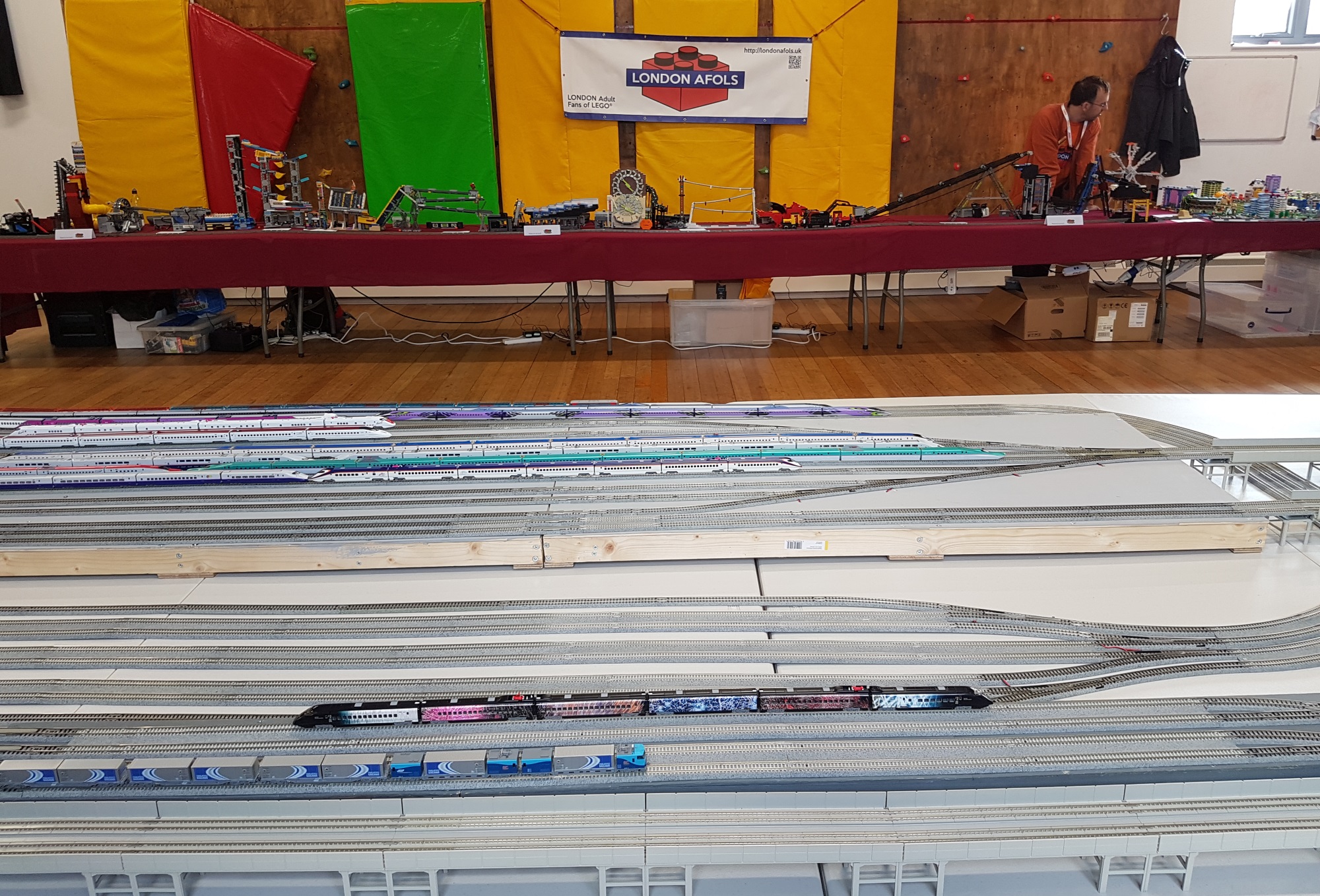 Down the other wall was the ‘adult’ Lego display, with a wonderful mechanism that transferred small balls from one end of the mechanism to the other, then returned them on the train. A fascinating bit of work, that worked well all day.