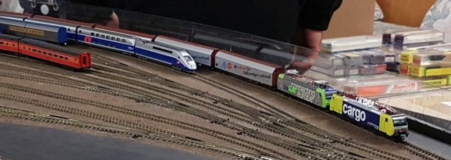 Only a couple of pictures tonight, as I spent too much of the evening talking. 16 persons present and it was good to welcome visitors Steve, Ken and Martin. Plenty of trains were on the move…..