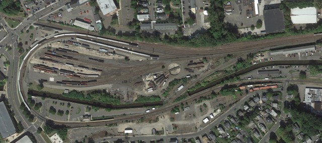 From the prototype for everything department. How about a yard inside a reversing loop, including an engine shed and turntable. Try Danbury, Connecticut, where there is a full loop at the end of the commuter services from New York. Lines also lead into the top left of the photo, and there is a branch off the loop bottom right (just the right place for the staging?)