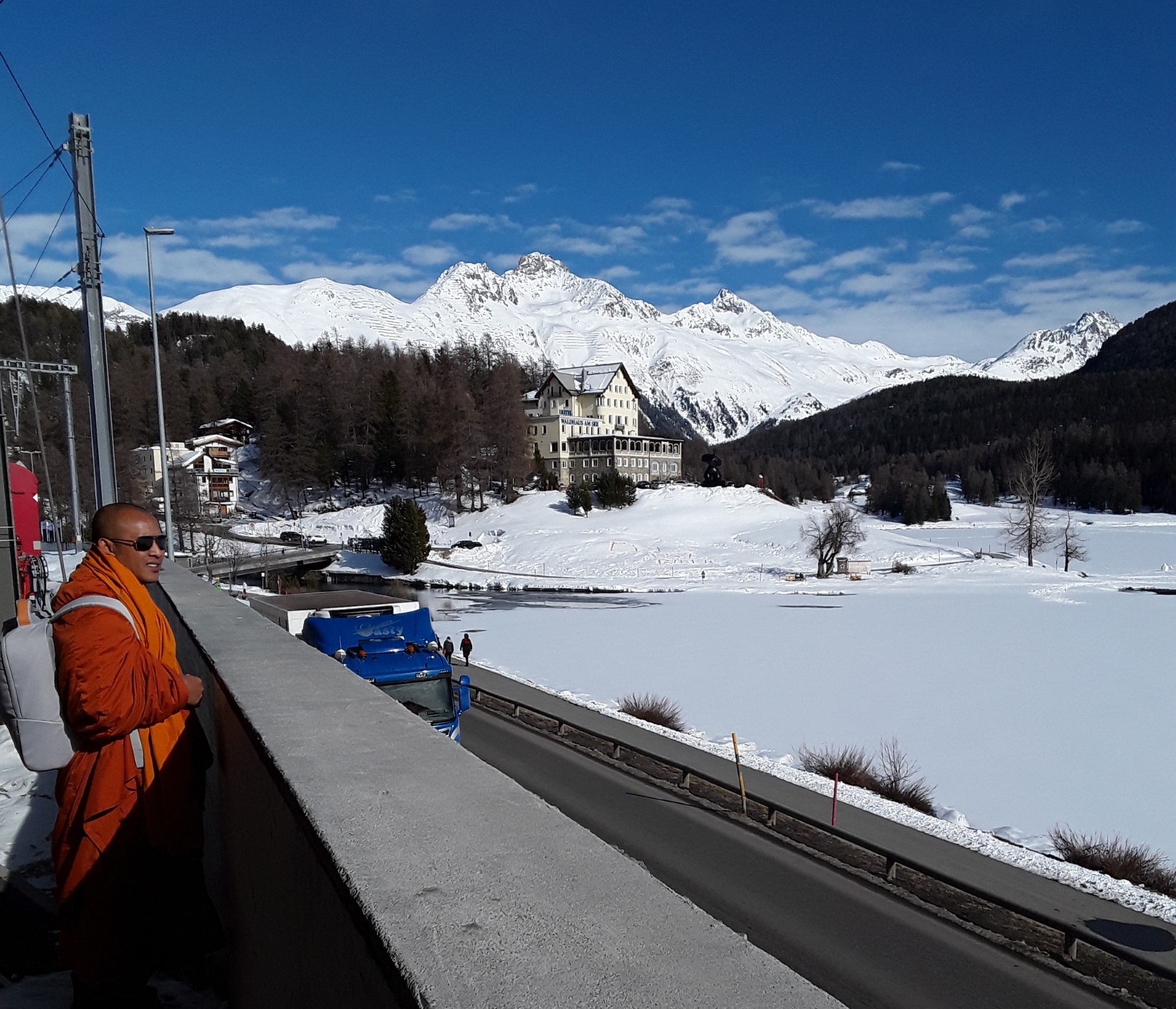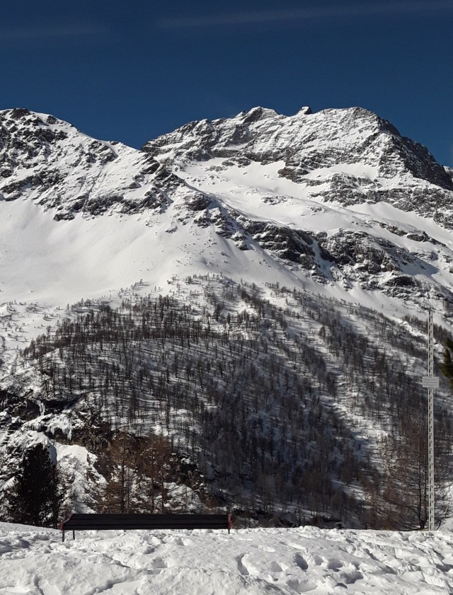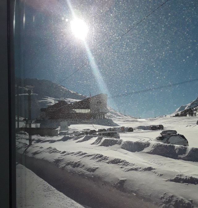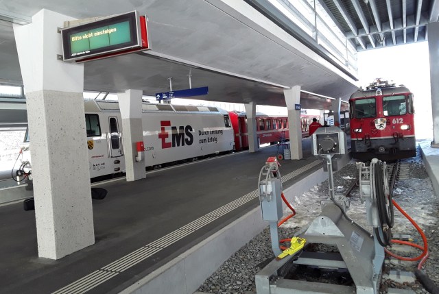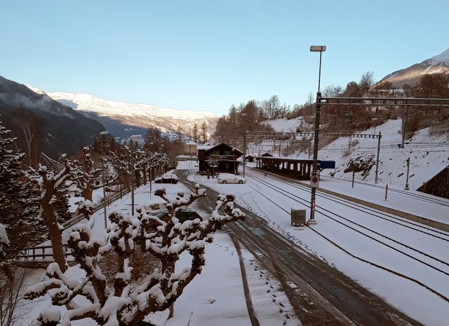 Woke up this morning to find there had been by UK standards a heavy snowfall overnight, most of which had melted by the time I got back this afternoon. Decided to head south and caught 0800 to Samedan for connection to Pontresina and the Bernina Line. I was surprised to find a snowplough truck attached to the front of the unit. Sitting in first carriage I could see the snow forced out to the side of the train sometimes blocking the view. I stayed on for the whole journey to Tirano in Italy but the snowplough was taked off at Poschiavo and the blades were white even though we had run out of the snow area and were running under a clear blue sky. Having spent 40 minutes in Italy, I took the train back to Alp Grum for an hour’s refreshment break (hot chocolate and apple strudel). I travelled back via St Moritz but the train back to Filisur was like a rush hour commuter train.