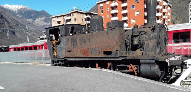 Rust bucket in sidings at Tirano (Italian side) RhB in background