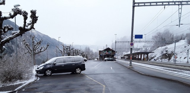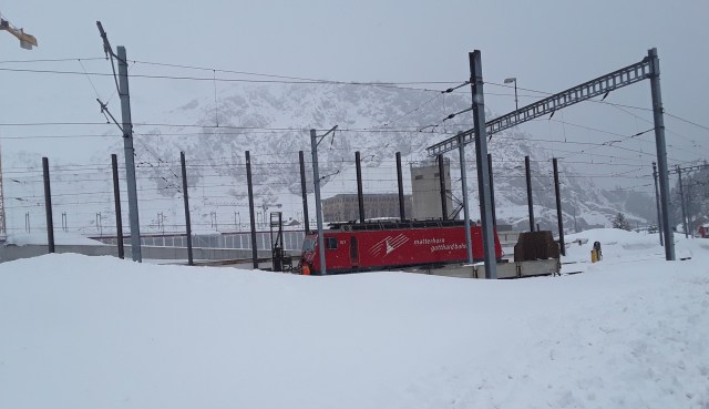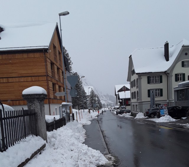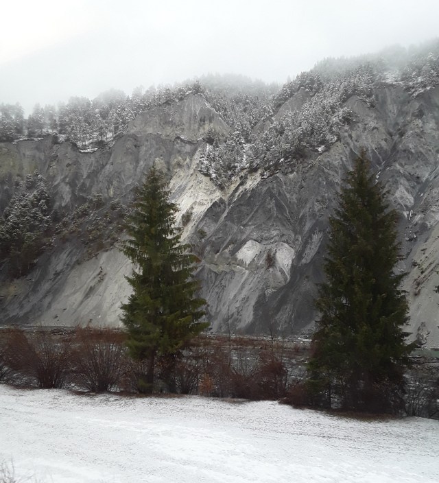 Another snowfall overnight. Decided to do the last long trip of my holiday and travelled by Reichenau and Disentis to Andermatt. Intended to take photos of the Oberalppass but it was a whiteout as was the descent to Andermatt. Had a walk in falling snow into the village for a hot drink and a cake. On return journey did not want to wait 20 minutes on cold platform at Reichenau so travelled by Chur where I managed to pick up items requested from home. Just been held nearly 10 minutes at Thusis as on coming train had technical problems. What was rain in Chur is now turning to snow.