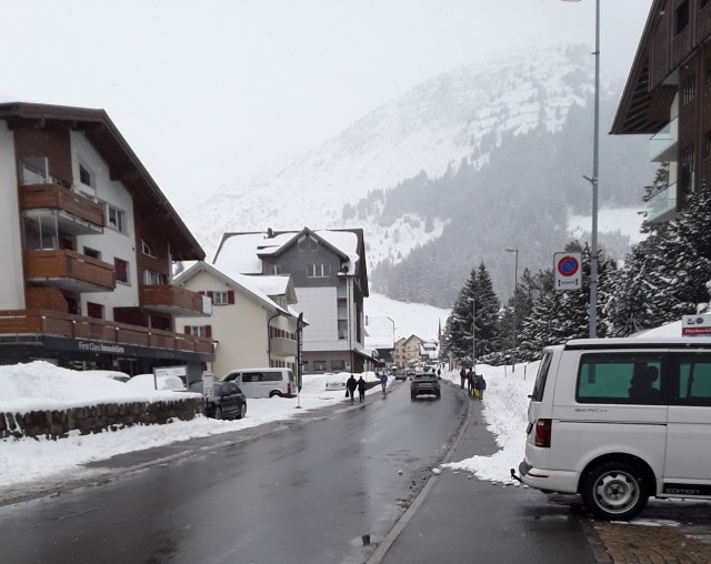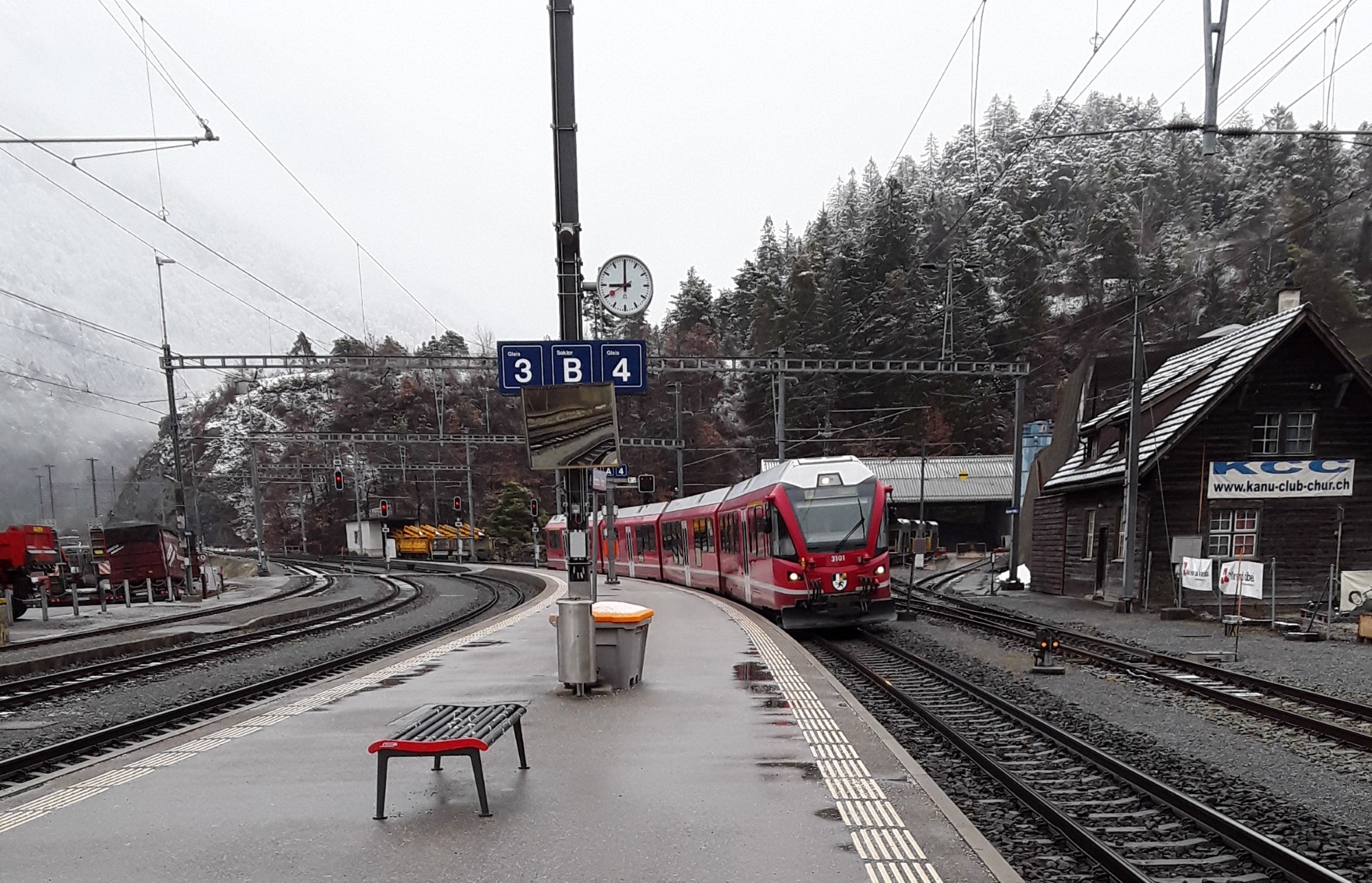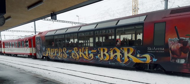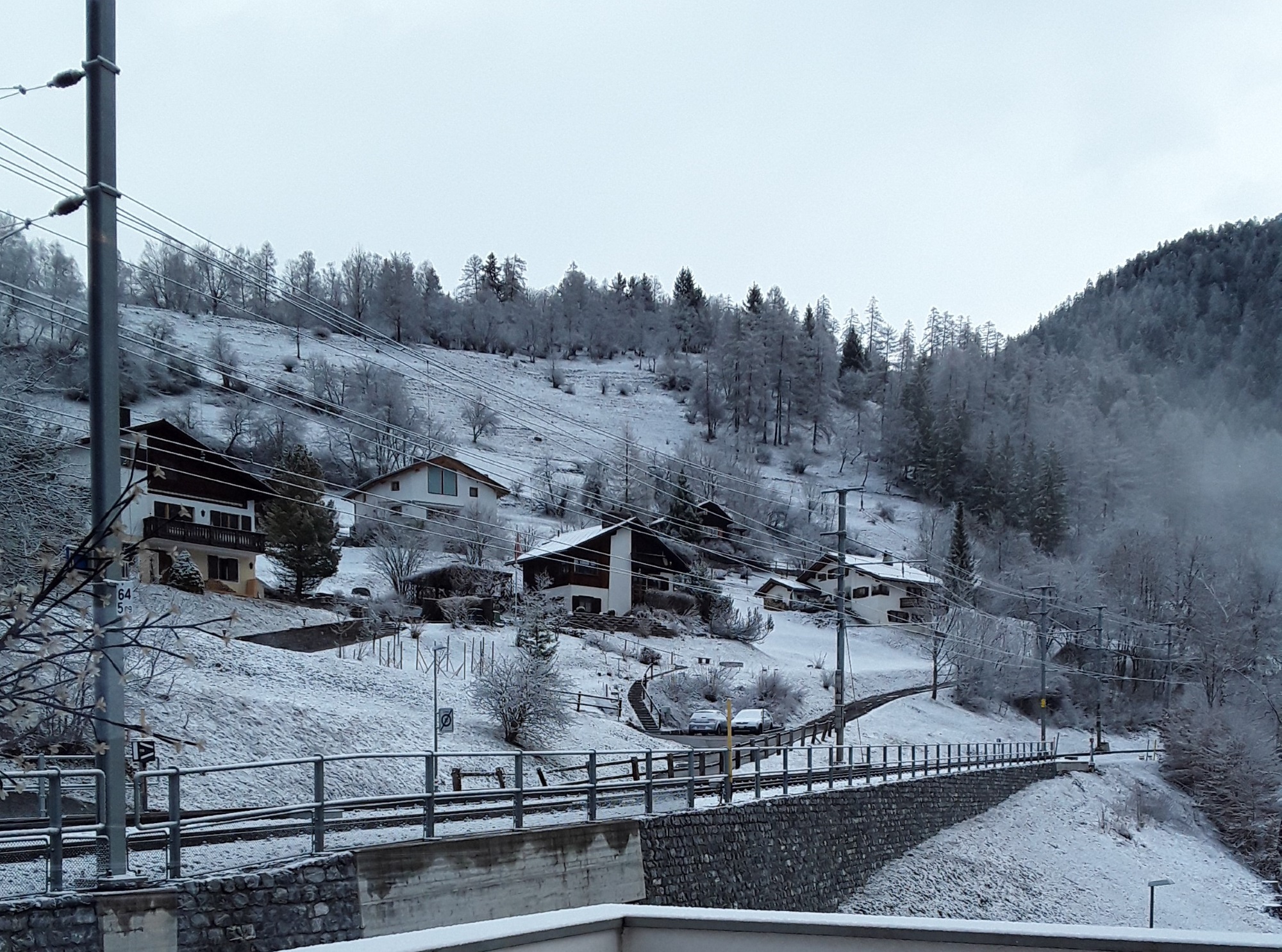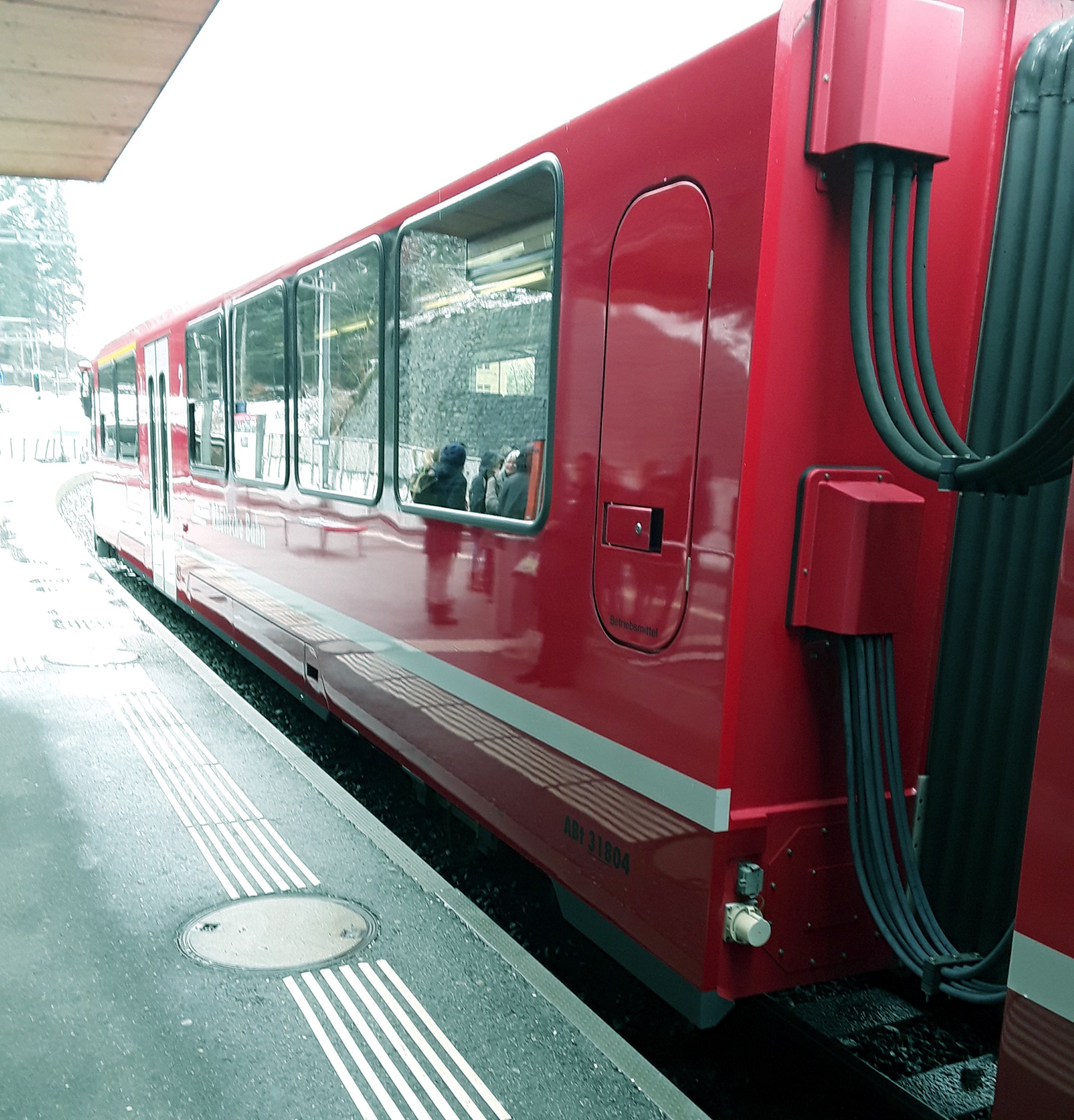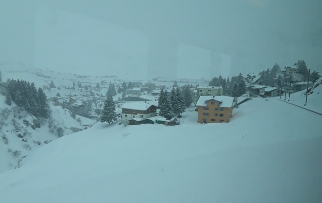 Another snowfall overnight. Decided to do the last long trip of my holiday and travelled by Reichenau and Disentis to Andermatt. Intended to take photos of the Oberalppass but it was a whiteout as was the descent to Andermatt. Had a walk in falling snow into the village for a hot drink and a cake. On return journey did not want to wait 20 minutes on cold platform at Reichenau so travelled by Chur where I managed to pick up items requested from home. Just been held nearly 10 minutes at Thusis as on coming train had technical problems. What was rain in Chur is now turning to snow.