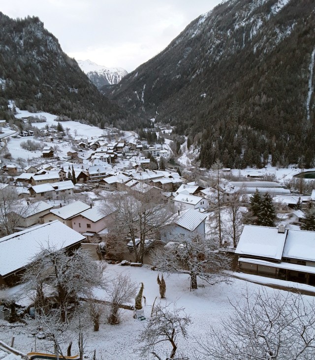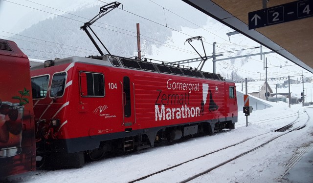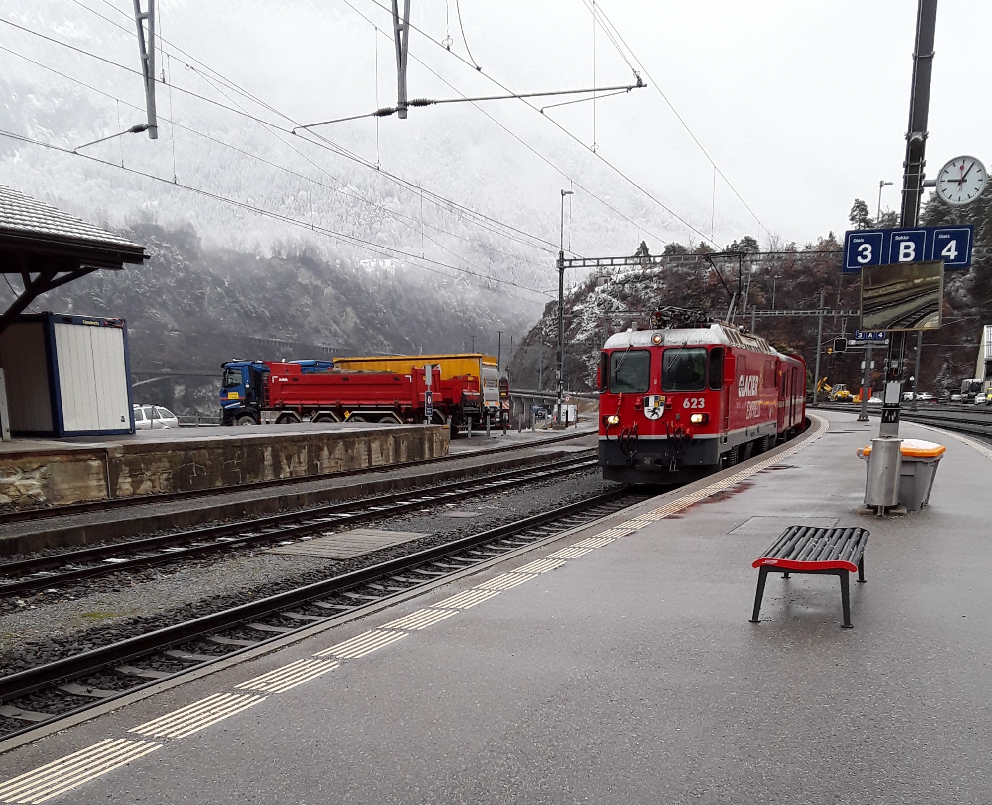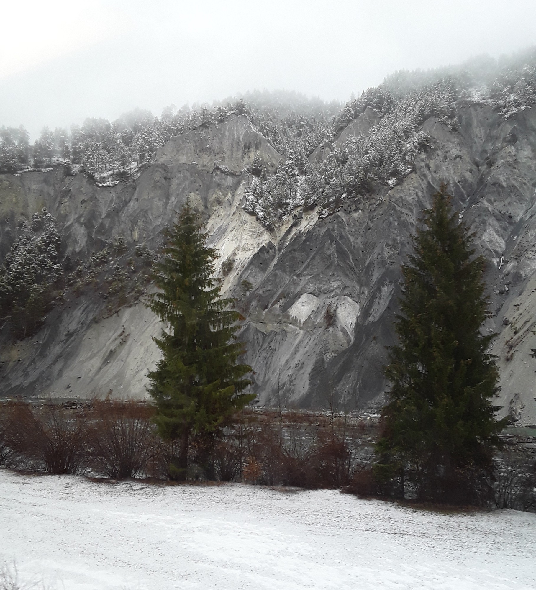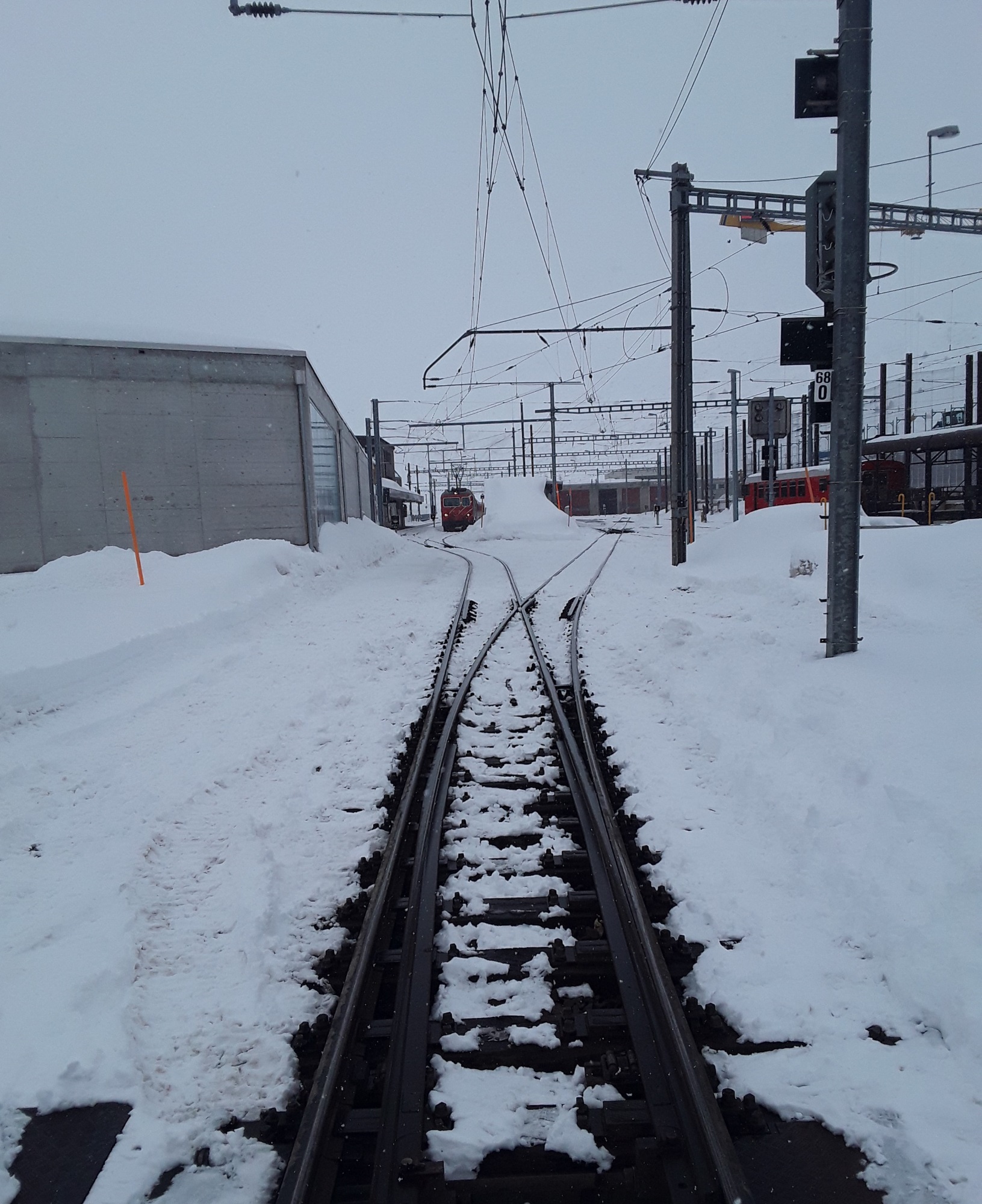 Another snowfall overnight. Decided to do the last long trip of my holiday and travelled by Reichenau and Disentis to Andermatt. Intended to take photos of the Oberalppass but it was a whiteout as was the descent to Andermatt. Had a walk in falling snow into the village for a hot drink and a cake. On return journey did not want to wait 20 minutes on cold platform at Reichenau so travelled by Chur where I managed to pick up items requested from home. Just been held nearly 10 minutes at Thusis as on coming train had technical problems. What was rain in Chur is now turning to snow.
