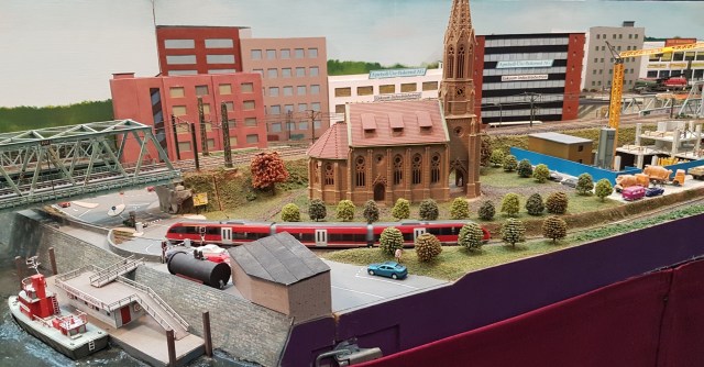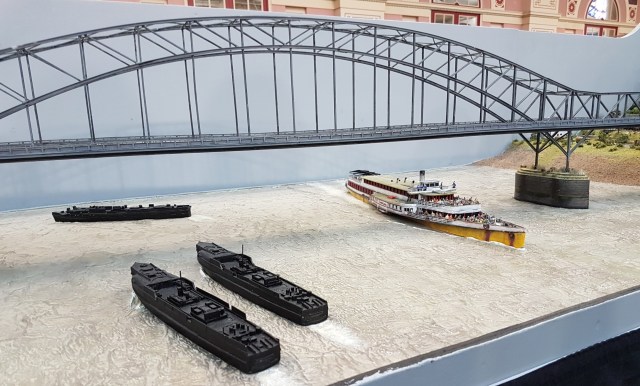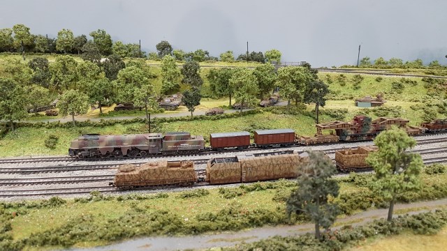 The Bridge at Remagen (N) is a true scale model of the Ludenorff bridge over the Rhine. The scenery is expansive, but it is also unusual in being set in 1944, with armoured trains and plenty of German tanks on the move by rail. I have heard of layouts showing ‘trains in the landscape’, but this takes it to a new level – trains difficult to spot in the landscape due to the camouflage.