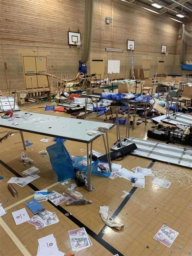 Like many of the UK model railway community, I have been shocked and saddened by the news about the Market Deeping MRC show in Stamford. As you have probably read, it had to be cancelled after four teenagers broke into the school at 4am on the Friday night and totally trashed four layouts and some traders stands, that had been set up early. It is probably fortunate that prompt action by neighbours, caretaker, and police prevented any damage to a second hall. Another nine layouts were due on the Saturday, and escaped damage. These photos, from the local paper, show the shocking extent of the damage. It was also the most read article on the BBC for a while.