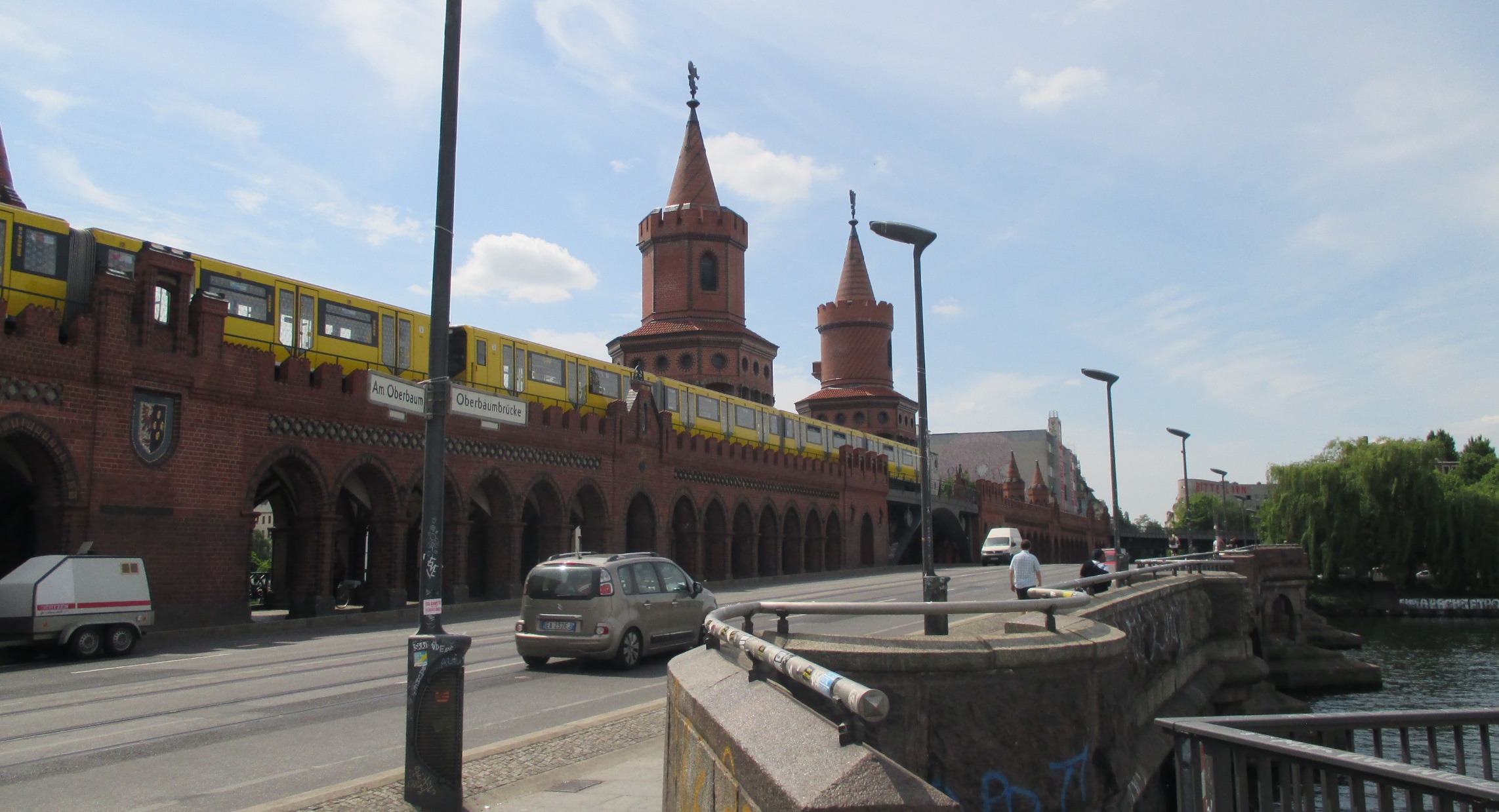 Leaving the terminus, the train crosses the River Spree by the Oberbaum bridge. This was a Cold War crossing point from east to west, and trains were unable to cross the river to the Warschauer Str. terminus. Old aerial photographs show all the tracks lifted. But with reunification, the terminus came back into use. The 3 photos below are taken from where the Berlin Wall and crossing point would have been. The longest remaining section of wall, decorated with murals lies behind me as I took the photos.