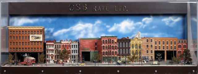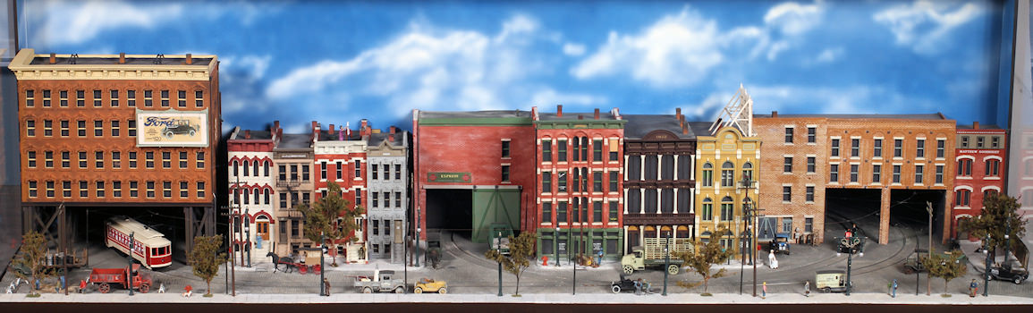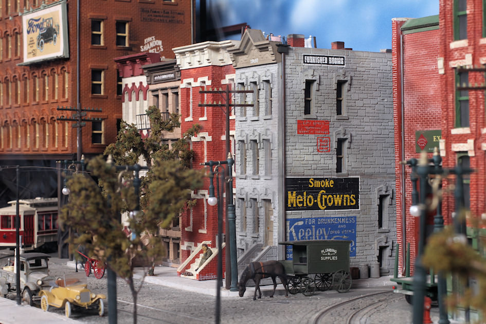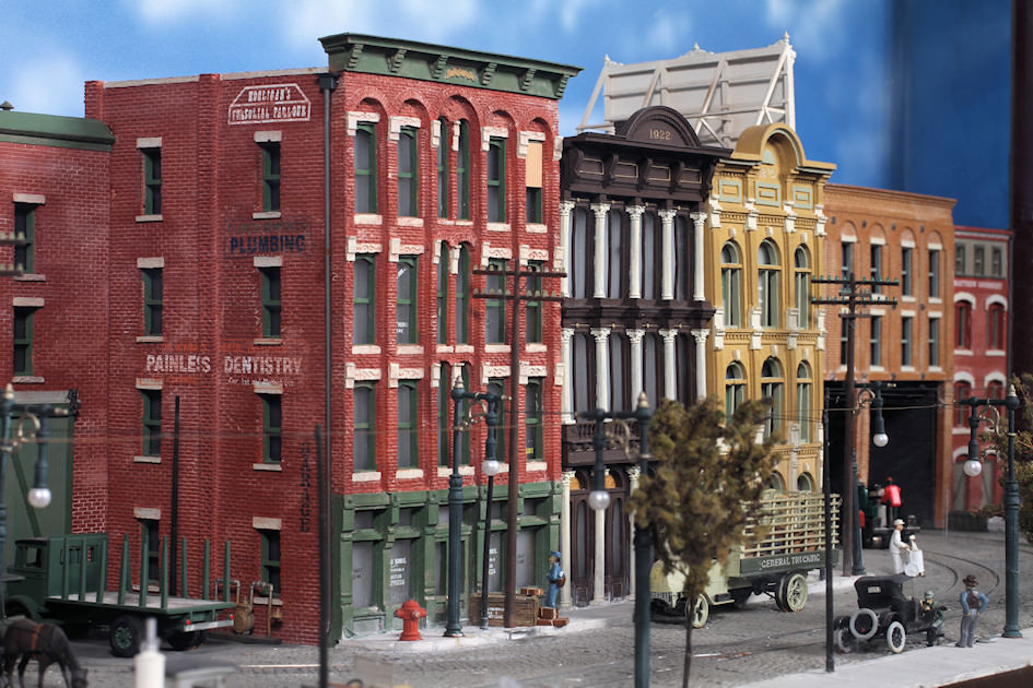 Recently, I came across this rather fine little trolley layout. Unfortunately, there are no sizes or track plan given. The plan is pretty obvious, though I’m not sure what happens around the back of the layout. As for size, it’s probably 4′ long – though one could get a good estimate from those DPM buildings.