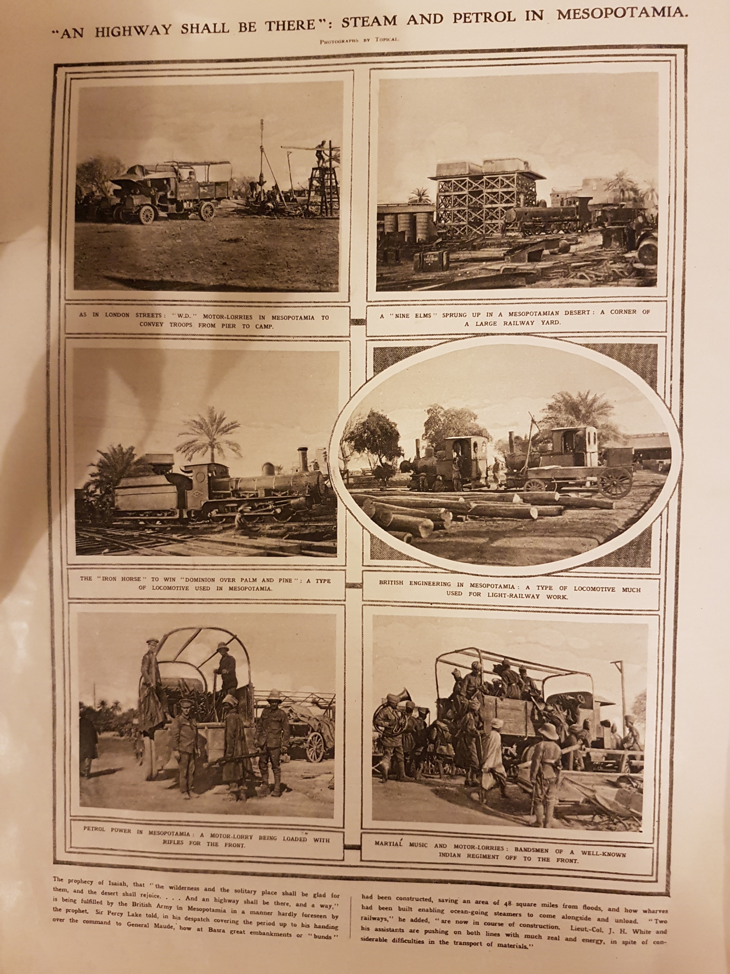 Maxine and I recently visited Polsden Lacey – again. But every time we find something new of interest. Browsing a 1917 copy of the London Illustrated news left around (as one does), I came across these pictures of the army using road and rail in what is now Iraq. Some interesting locomotives and I liked the caption (top right) ‘A “Nine Elms” sprung up in a Mesopotamian desert’.