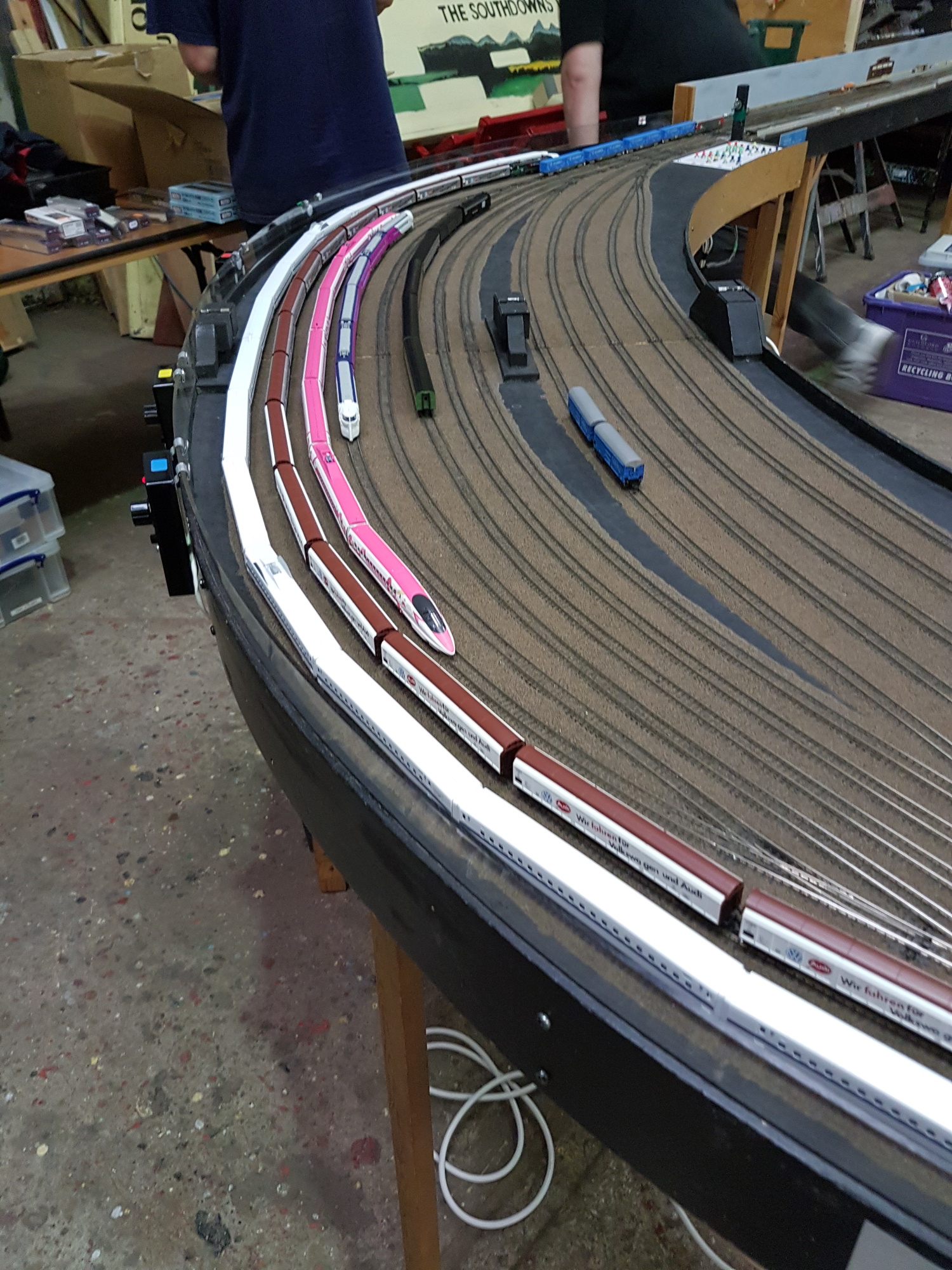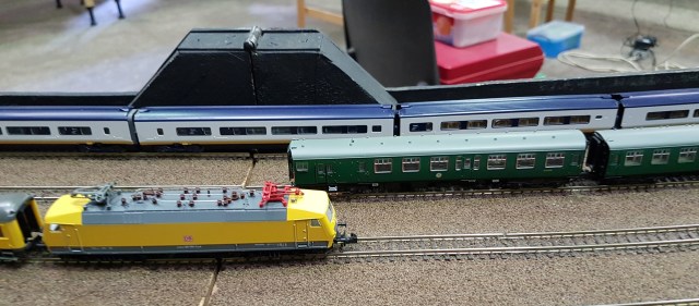 We were located in the storeroom and paint shop. Rather dusty, but not as oily as the Bluebell Railway show! Saturday was Japanese bullet day, as Paul brought along a selection of his trains. I ran my Kato Penn Central set for six hours, and it wasn’t even warm at the end of the afternoon.