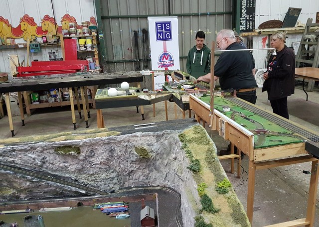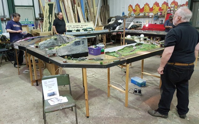 Derek’s Junction and Goonhilly radomes made an interesting diversion. We forgot two things on the day – I forgot the bridge for the fiddle yard with the track numbers on it to help operate the points. Derek forgot the scenic inset for the junction – so we covered it with flyers for NGSE 2020. Amazingly, some people took them (but we didn’t sell any ESNG wagons.)