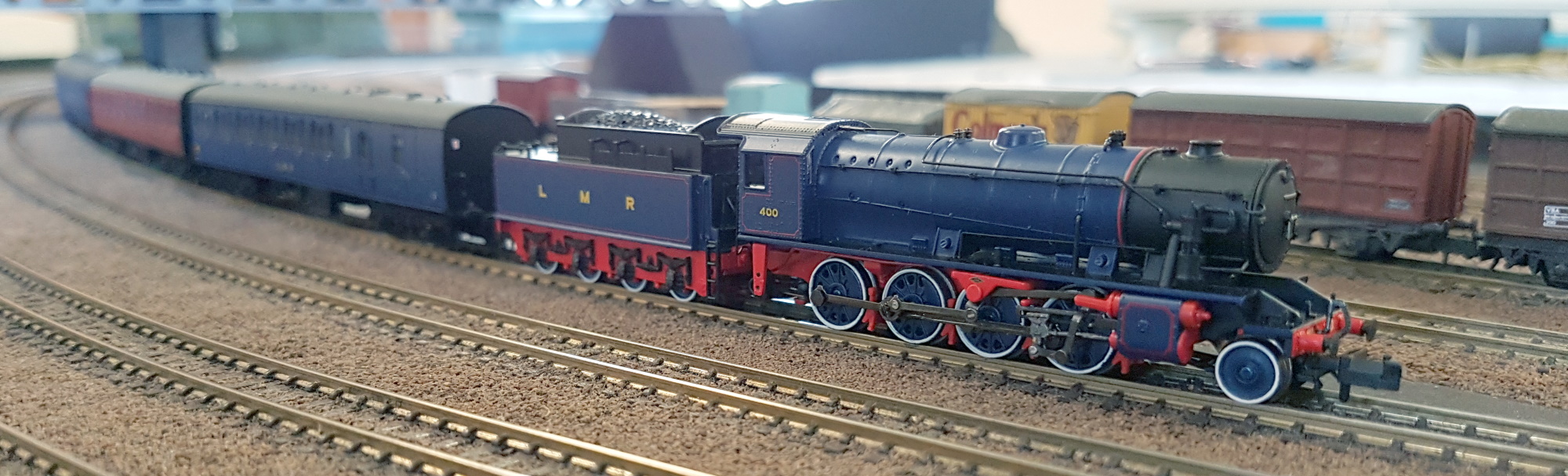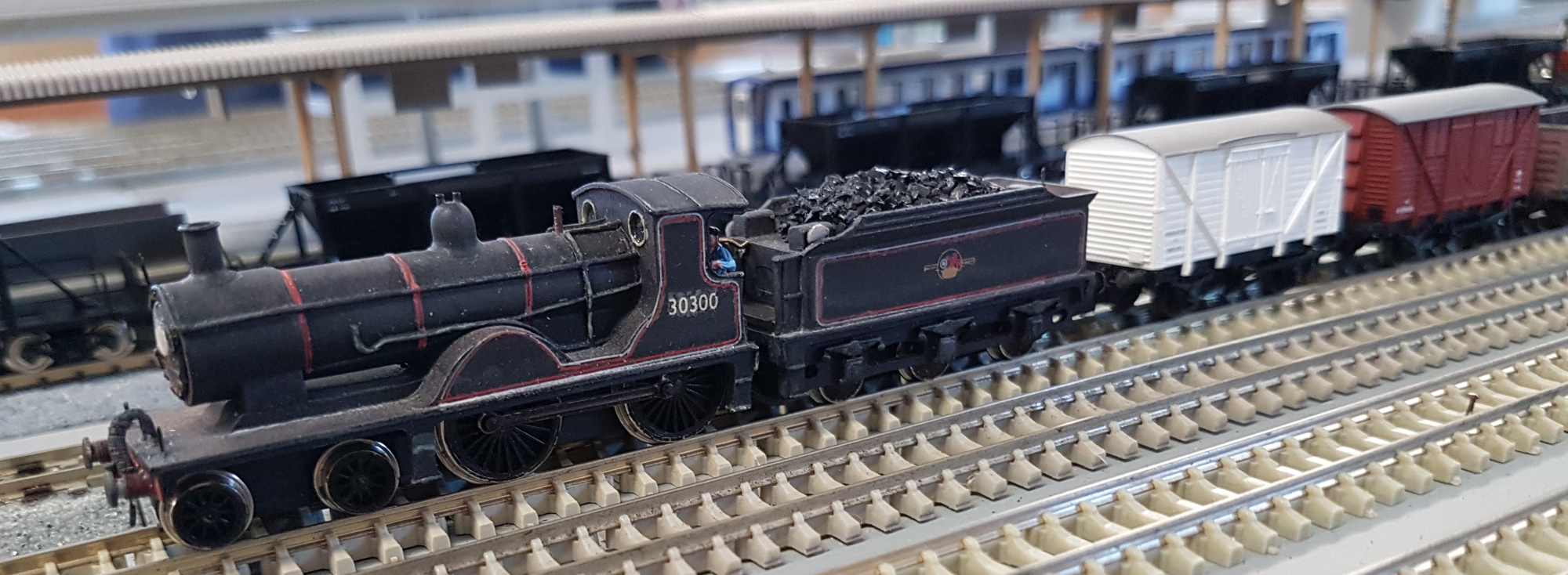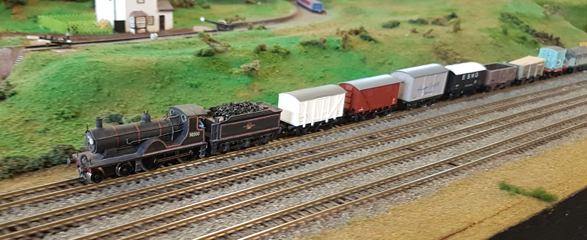 Chris had a Union Mills T9 on a short goods train. The locomotive has been improved with added details, and BR mixed traffic lining.