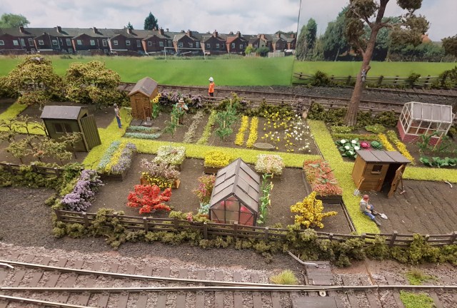 Durham Road TMD (O) is loosely based on the depot at Hither Green. It’s one layout where sound seems to work. Unlike some depot layouts that have the sound wound up too high, Durham Road just has a gentle tickover in the background. And there are some beautiful diesel models (and occasional steam specials) on show, though I hate to think what the insurance value of the layout is. Just down the line is one of the best modelled set of allotments that I have seen. You can work out what the plants are!