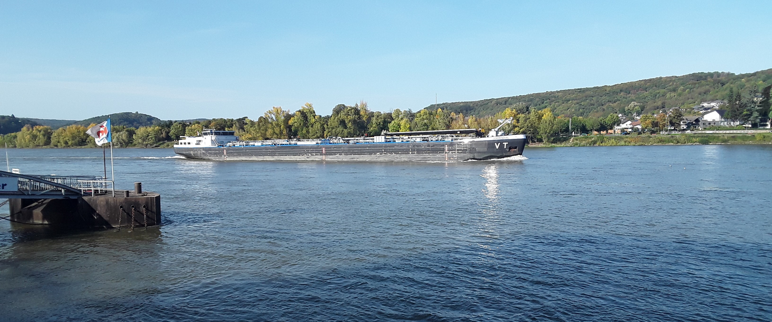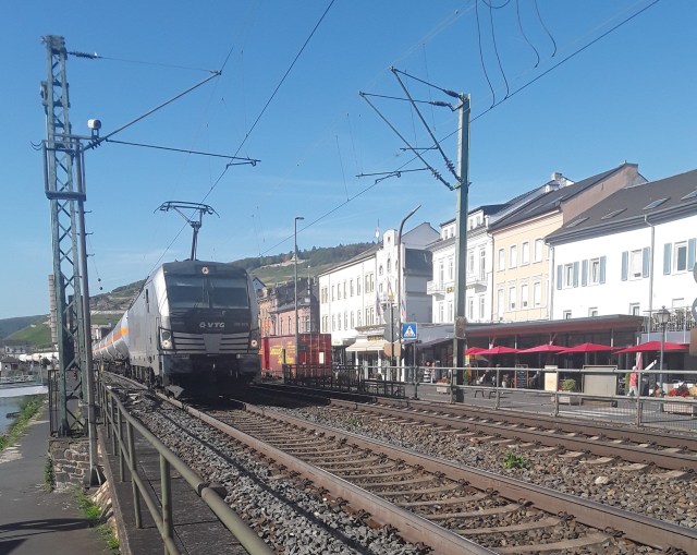 A hot and sunny day and saw an outdoor thermometer showing 28°. Today was a group visit to Rudesheim leaving on 0904 returning at 1642. From Remagen we changed in both directions in Koblenz to use trains running down the east bank of the Rhine. As on a previous visit due to the amount of freight the platform door is not open until the train is arriving in the station. At Rudesheim the train runs along the river bank separating the shops from the promenade